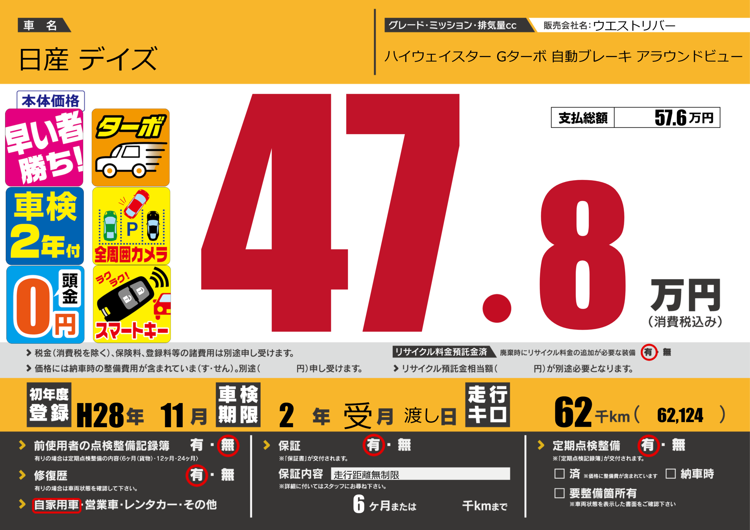 | 車名 | 日産 デイズ | グレード ミッション 排気量 |