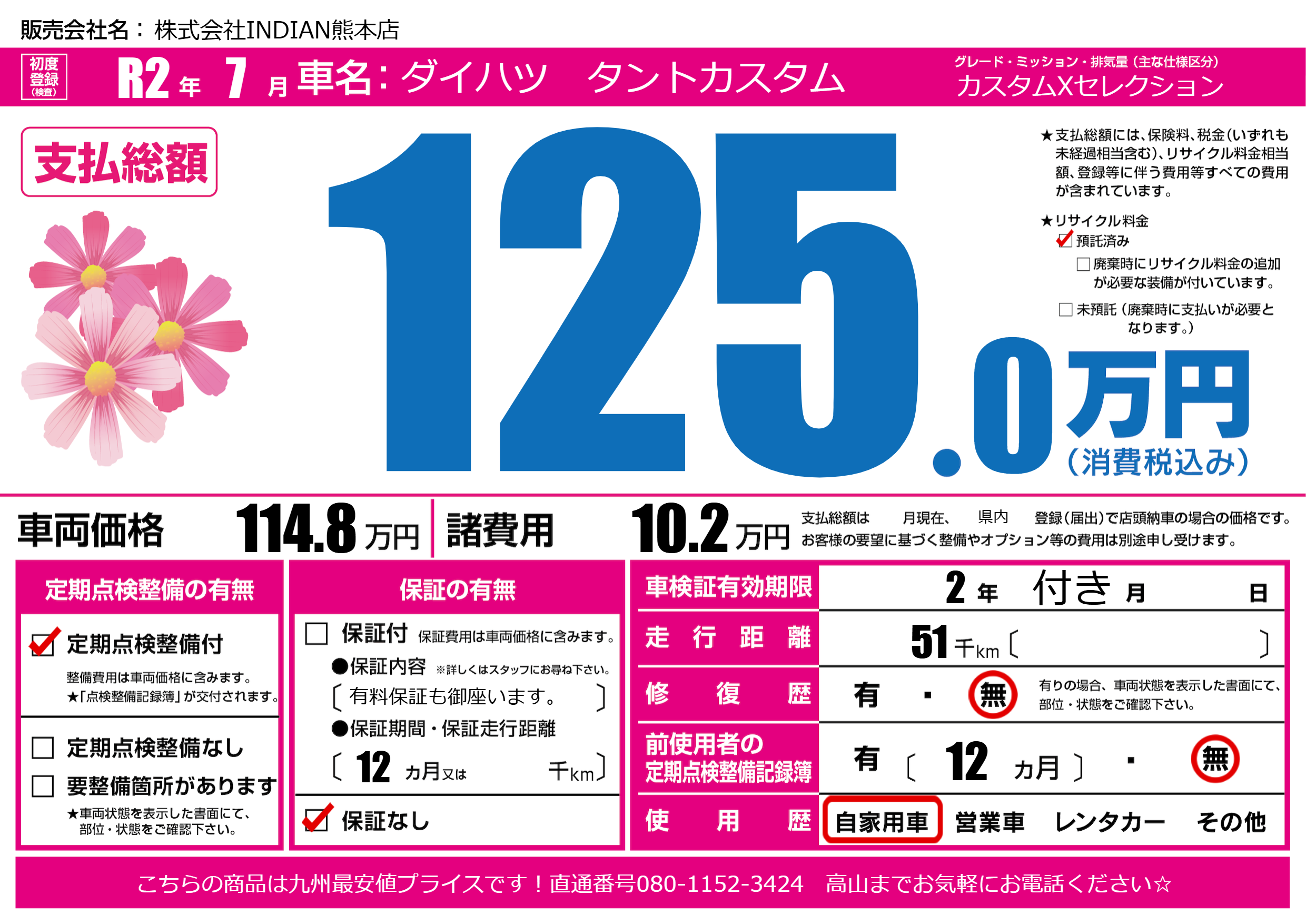 | 車名 | ダイハツ タントカスタム | グレード ミッション 排気量 |