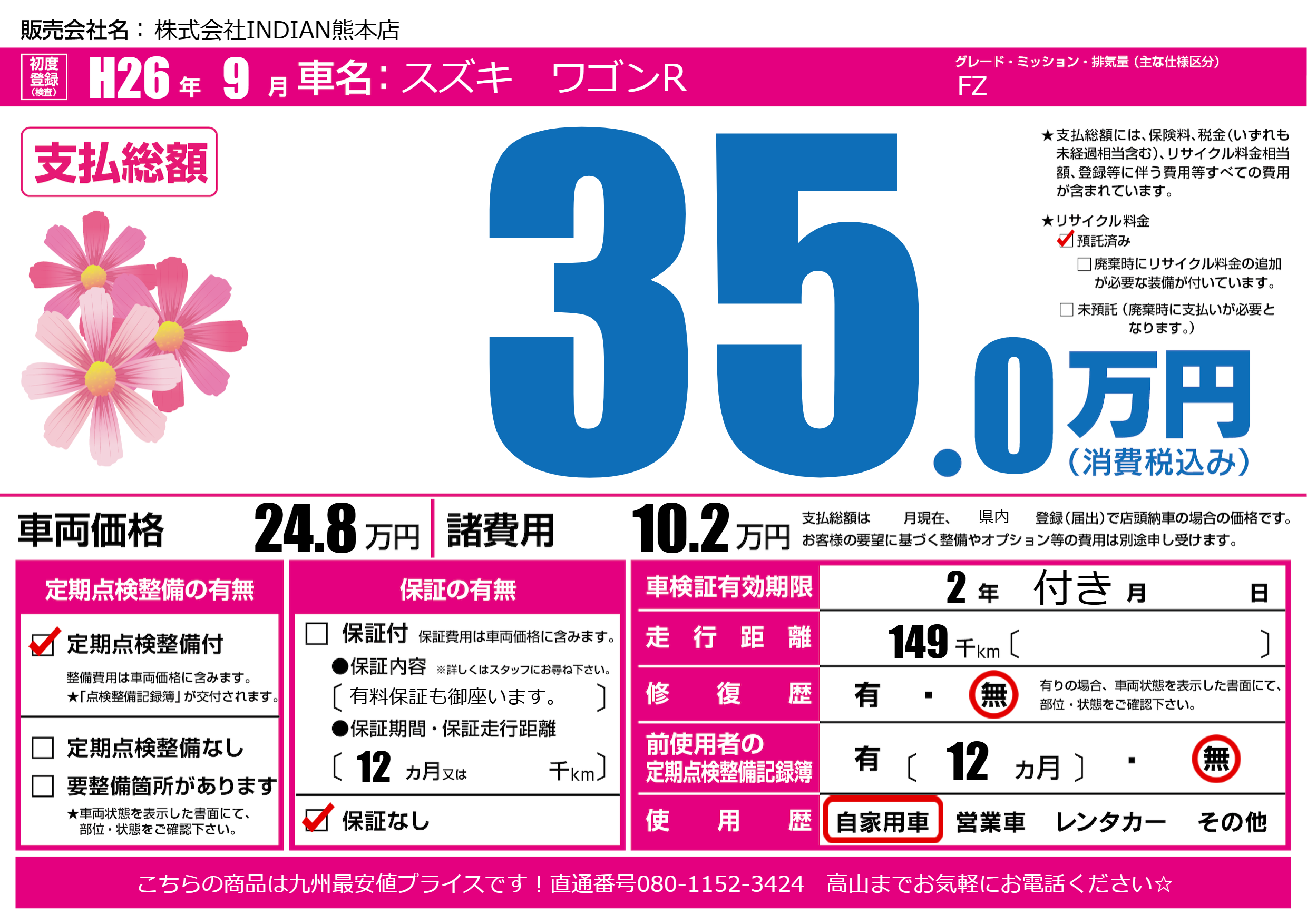 | 走行キロ | 14.9万km | 初年度登録 | H26年9月 |