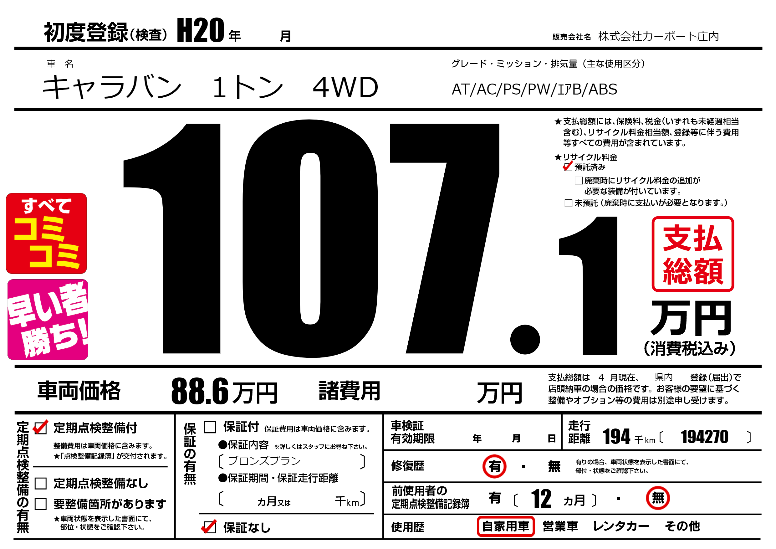 | 車名 | キャラバン 1トン 4WD | グレード ミッション 排気量 |