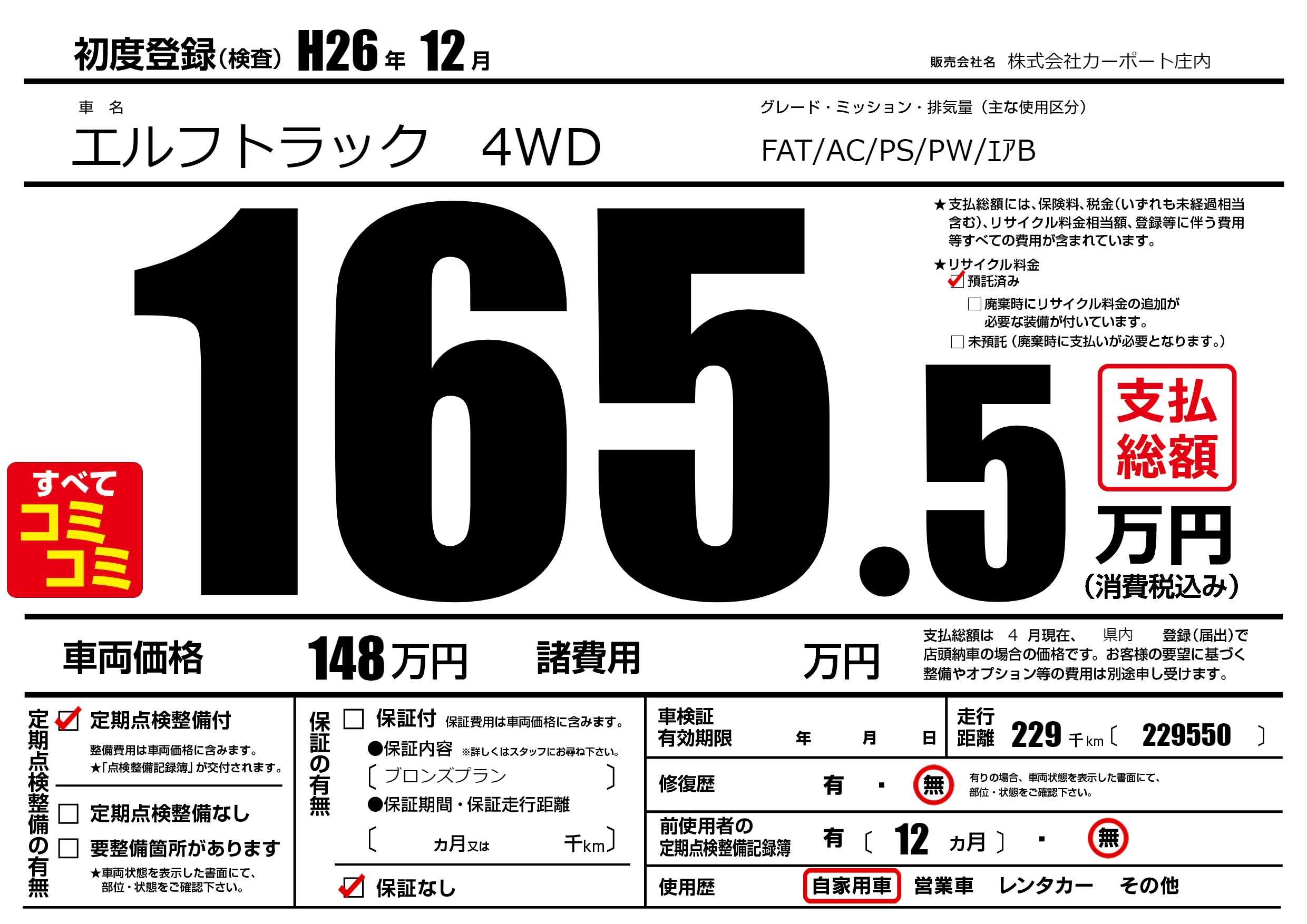 | 車名 | エルフトラック 4WD | グレード ミッション 排気量 |