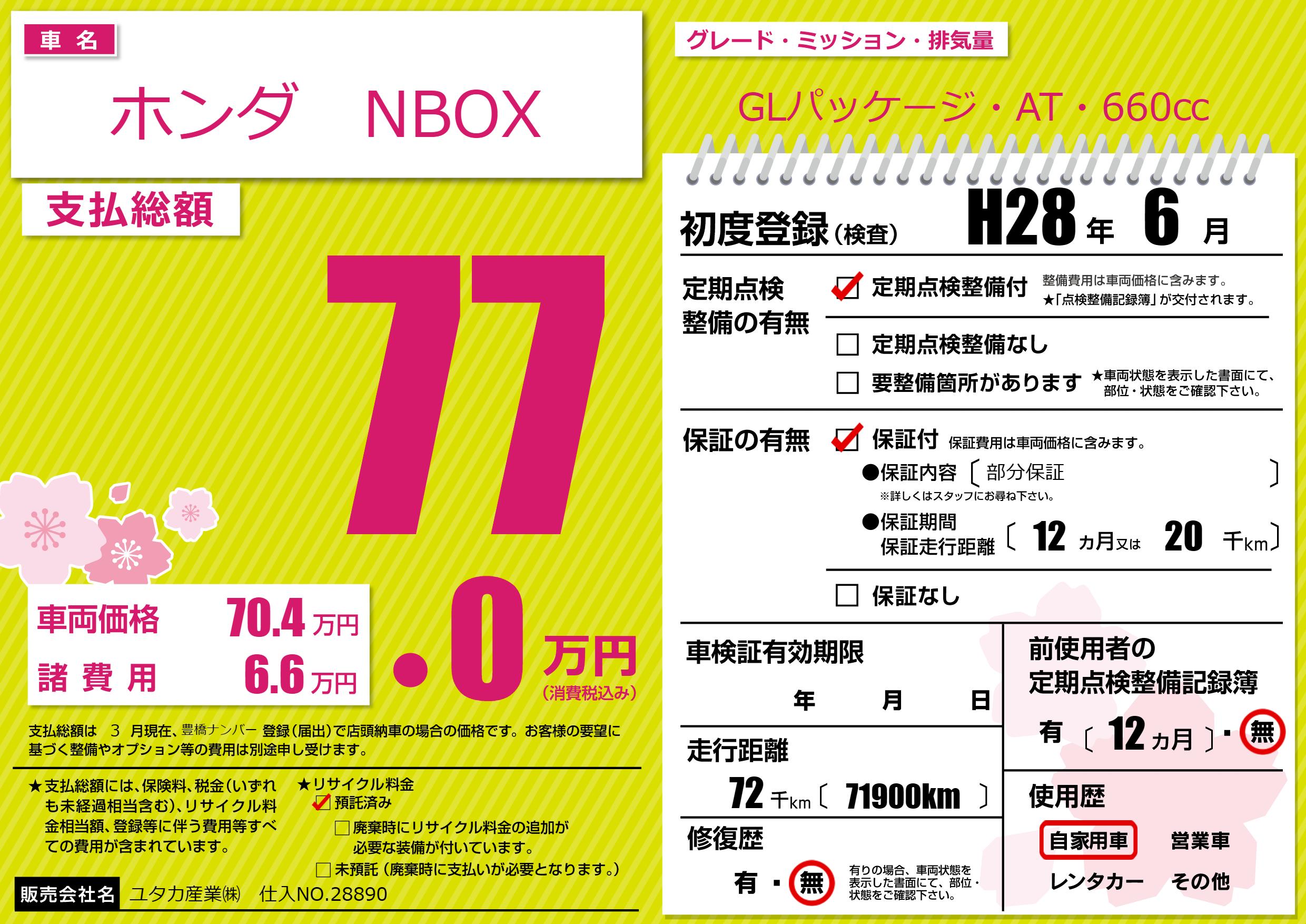 | 車名 | ホンダ NBOX | グレード ミッション 排気量 |