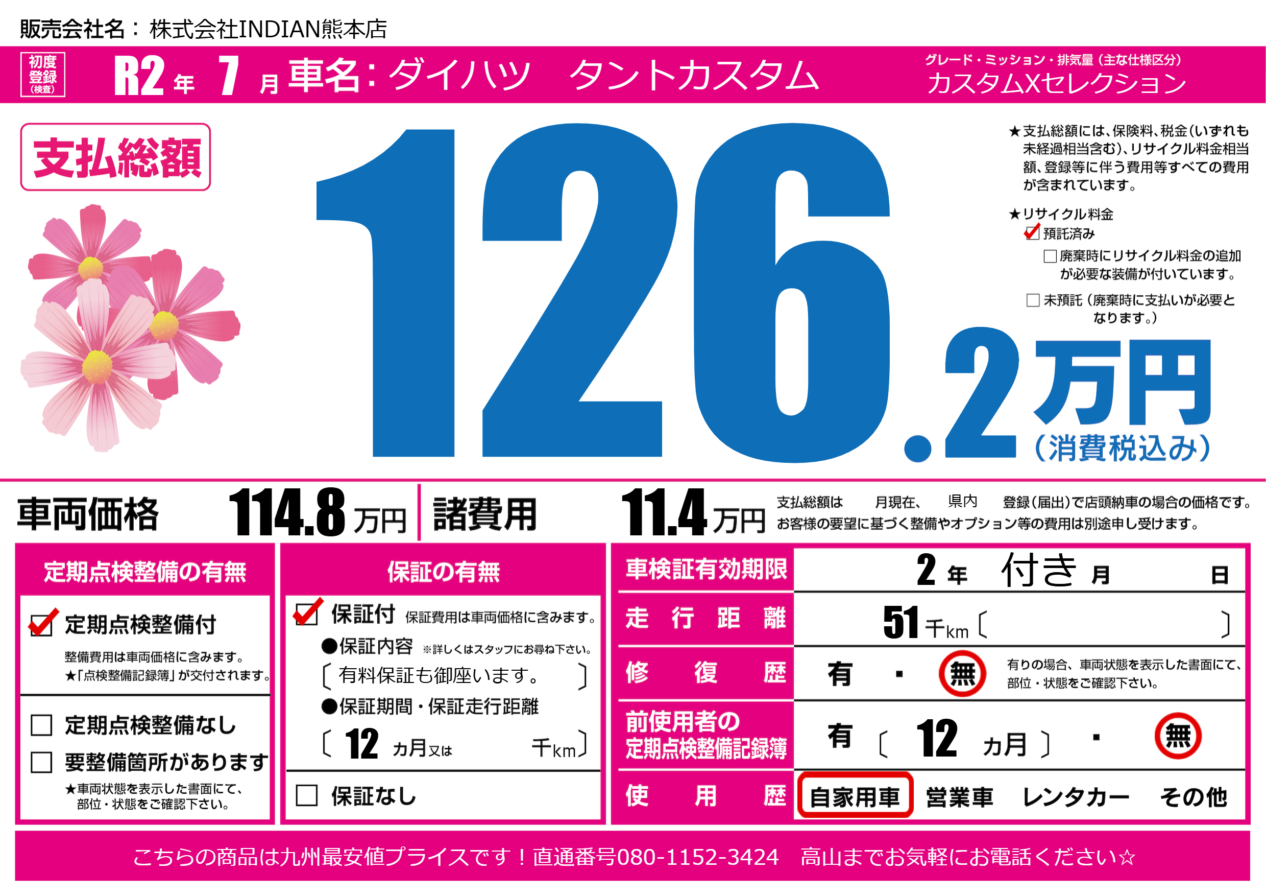 | 車名 | ダイハツ タントカスタム | グレード ミッション 排気量 |