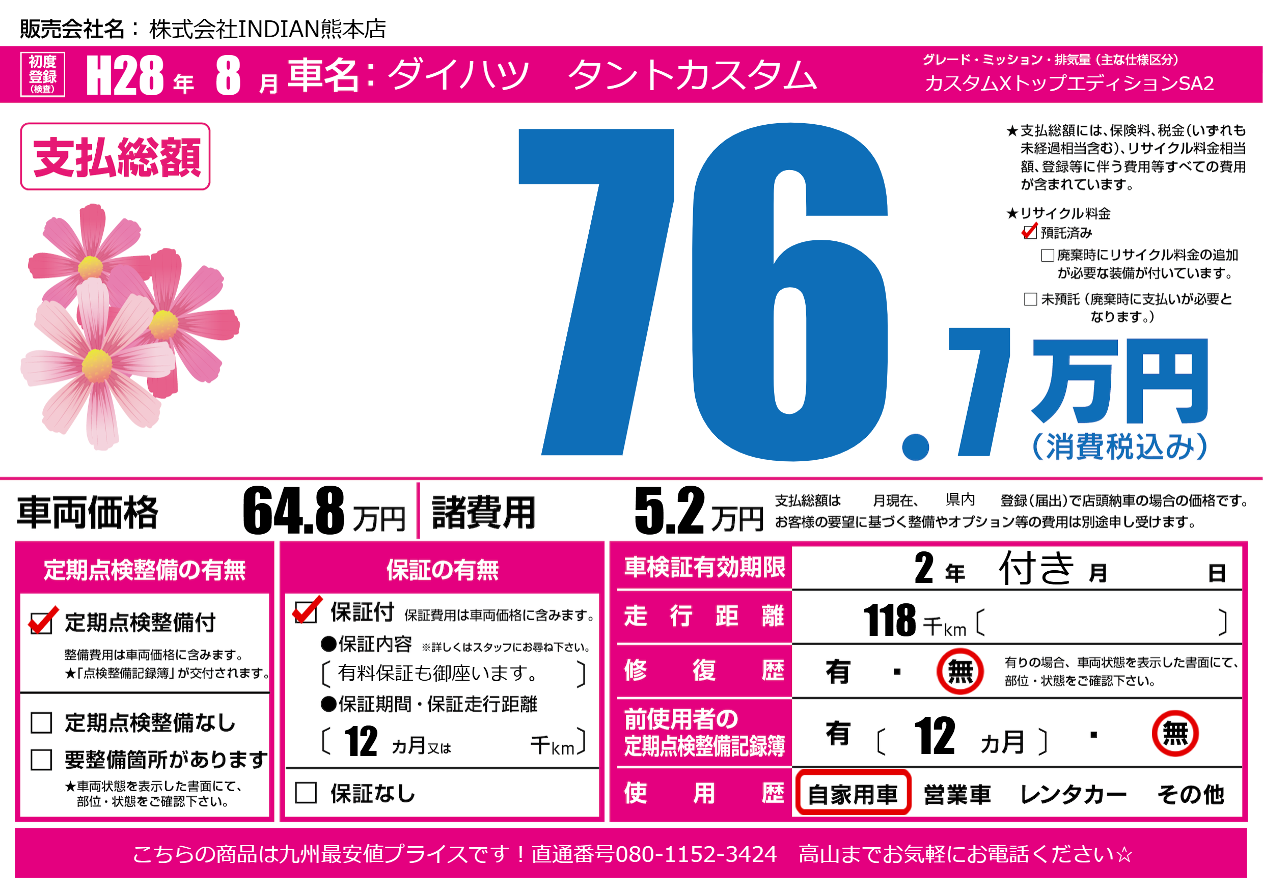 | 車名 | ダイハツ タントカスタム | グレード ミッション 排気量 |