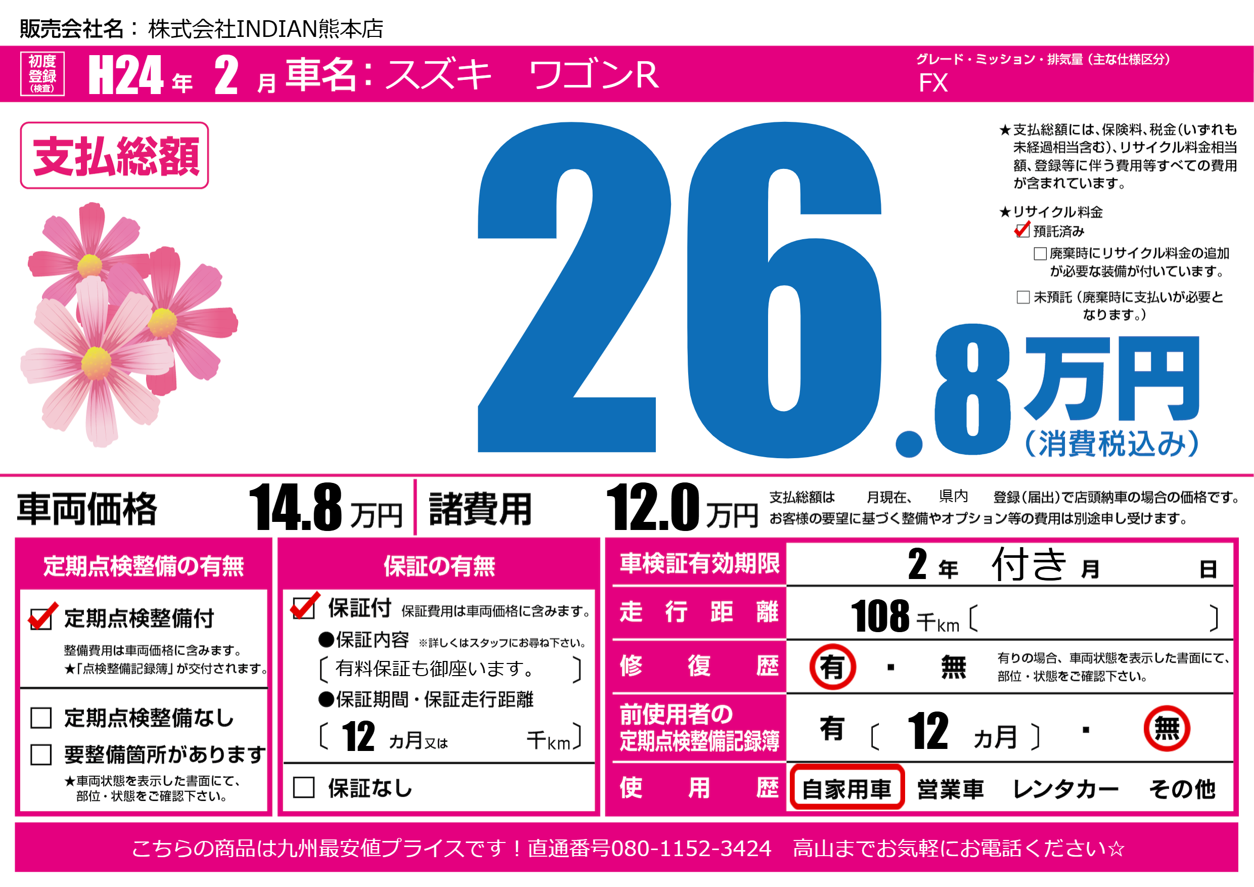 | 走行キロ | 10.8万km | 初年度登録 | H24年2月 |