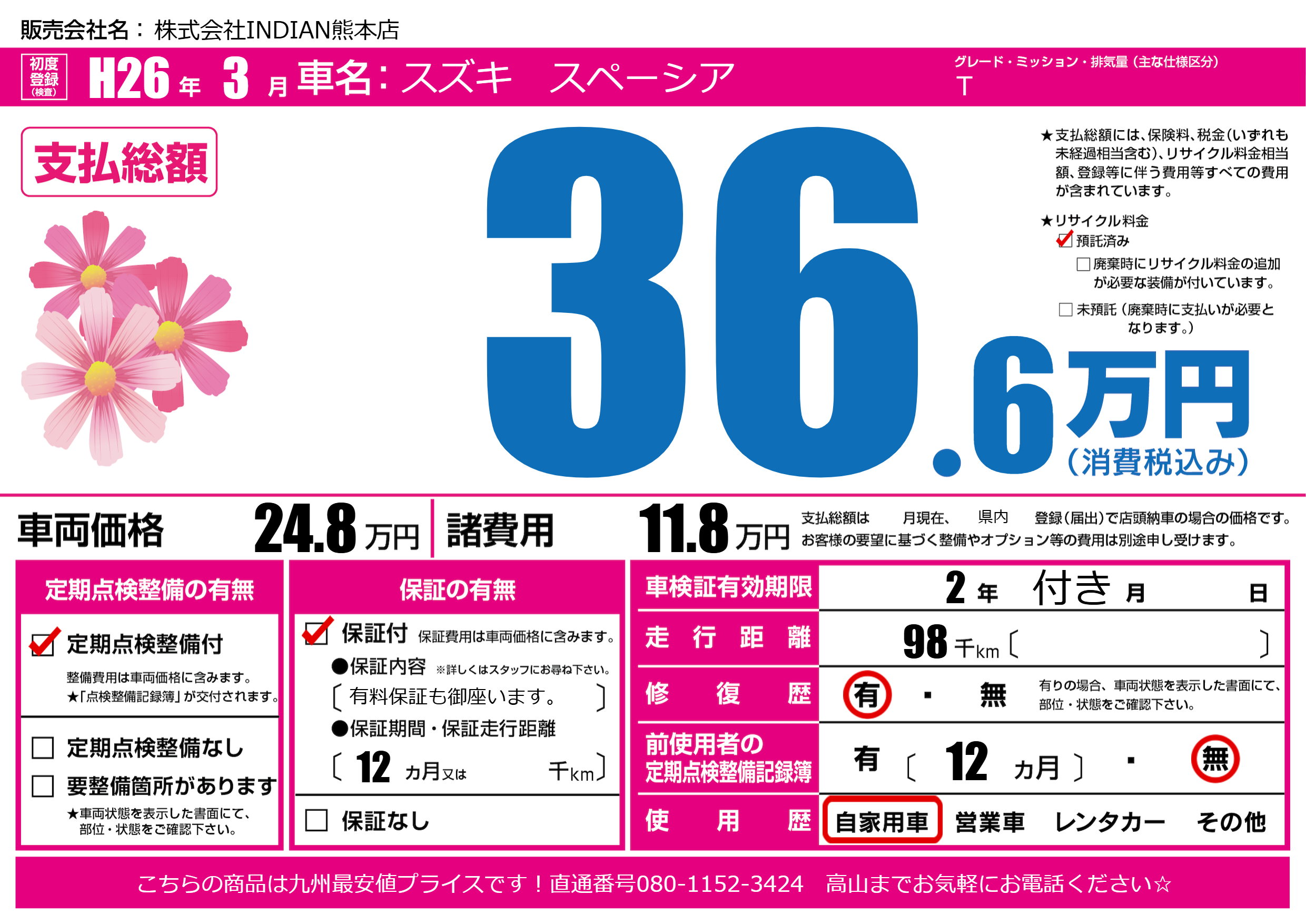 | 走行キロ | 9.8万km | 初年度登録 | H26年3月 |