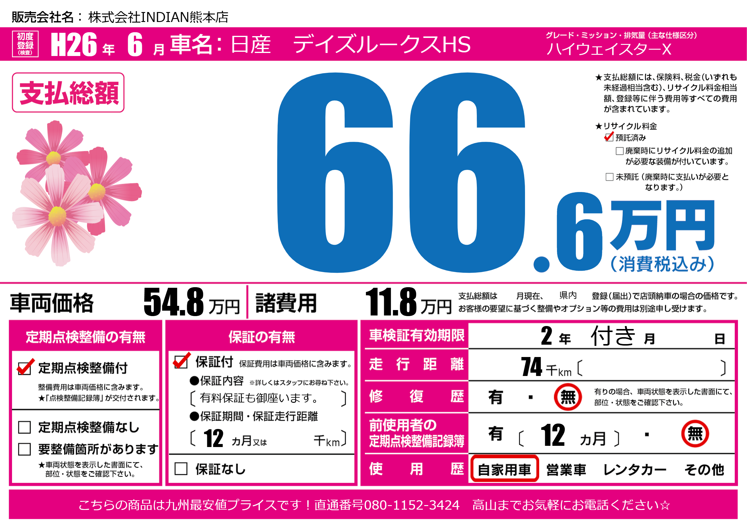 | 車名 | 日産 デイズルークスHS | グレード ミッション 排気量 |