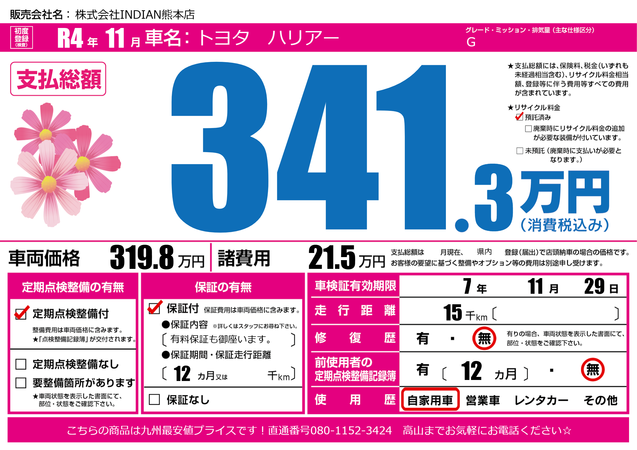 | 走行キロ | 1.5万km | 初年度登録 | R4年11月 |