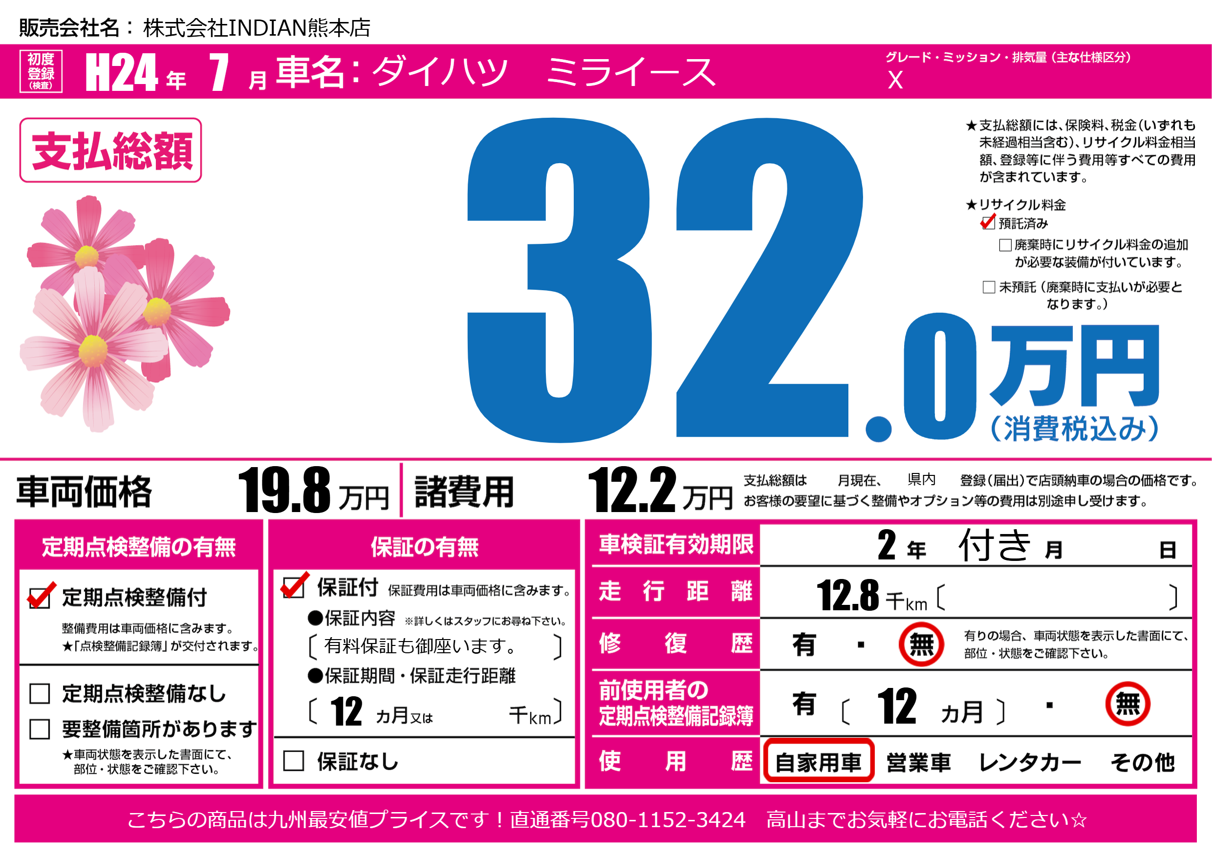 | 走行キロ | 1.2万km | 初年度登録 | H24年7月 |