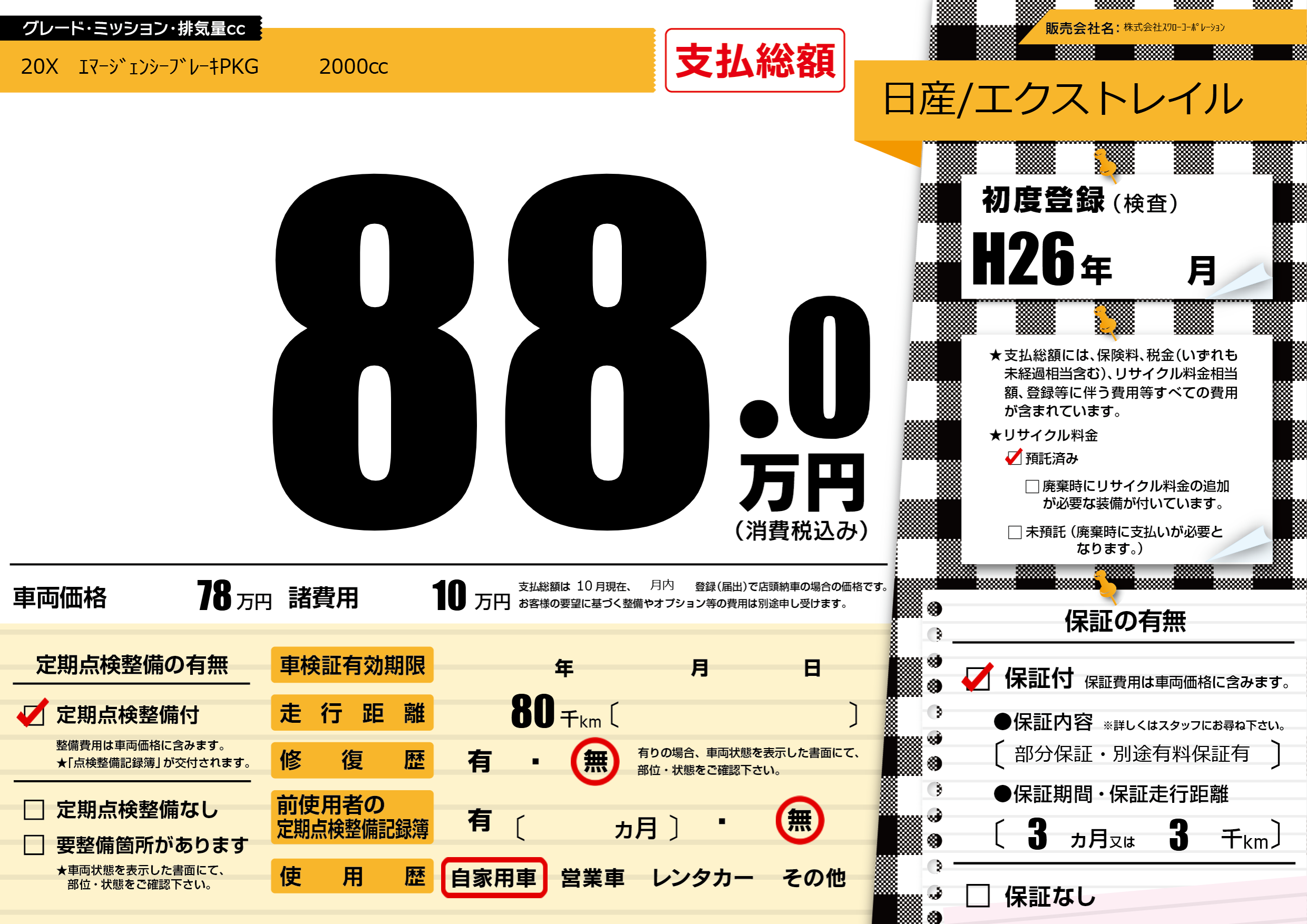 保証付き 保証内容(部分保証・別途有料保証有) 3ヶ月または(3)千kmまで |
