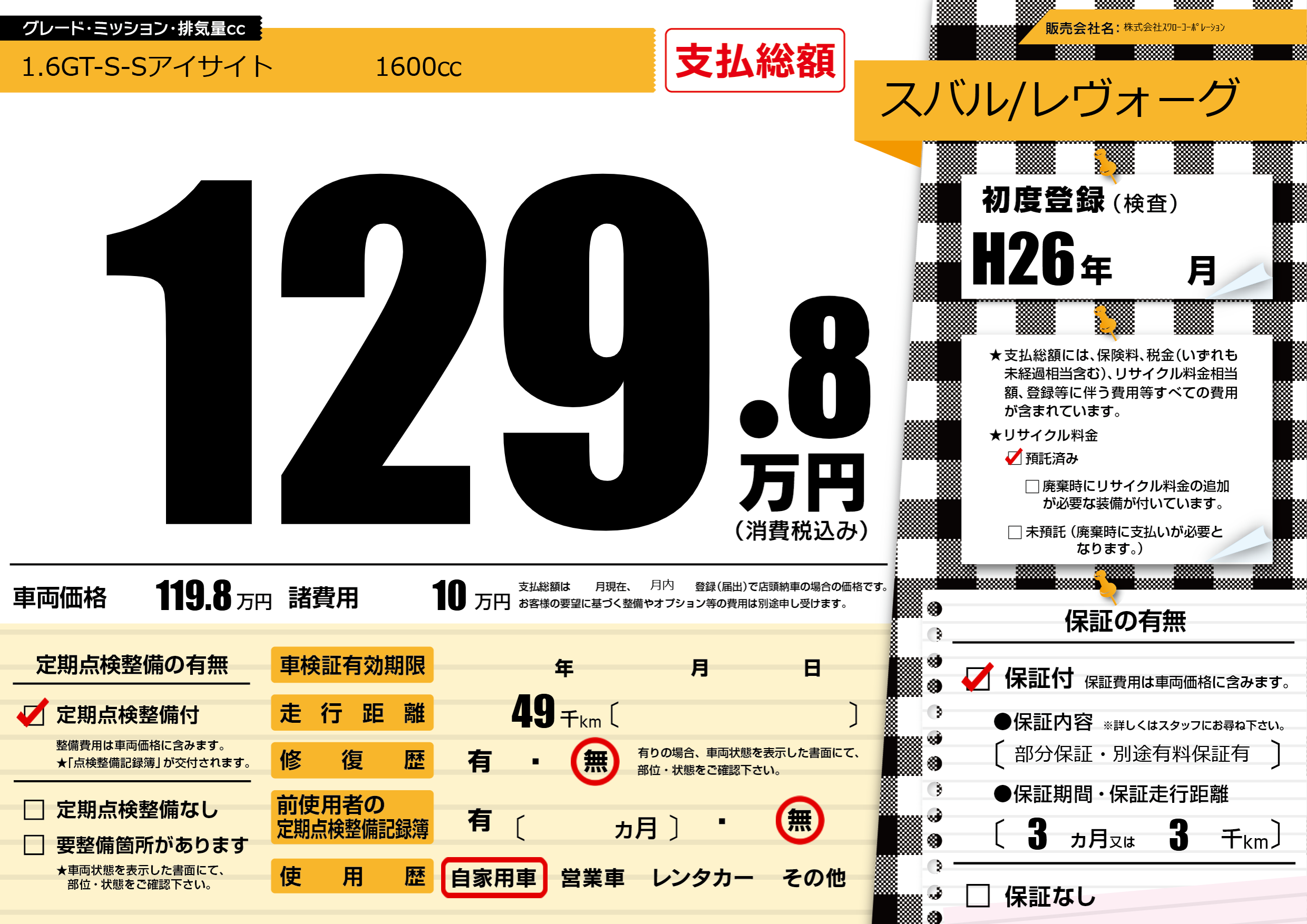 | 走行キロ | 4.9万km | 初年度登録 | H26年---月 |