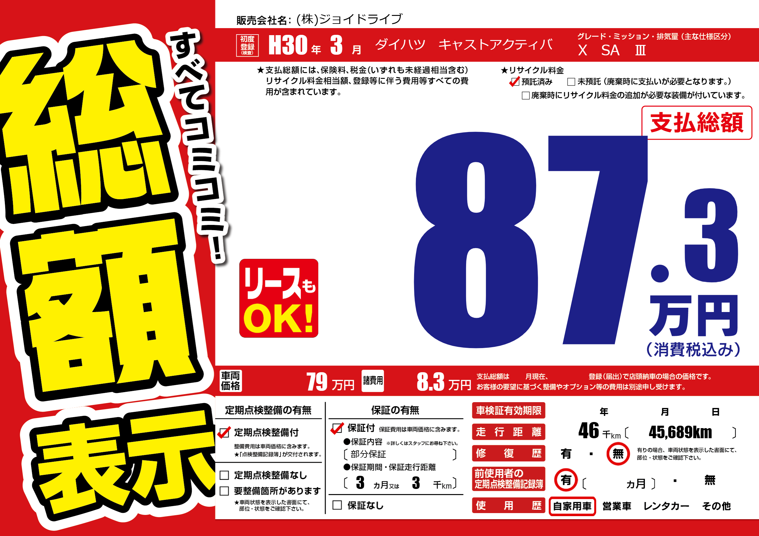 | 車名 | ダイハツ キャストアクティバ | グレード ミッション 排気量 |