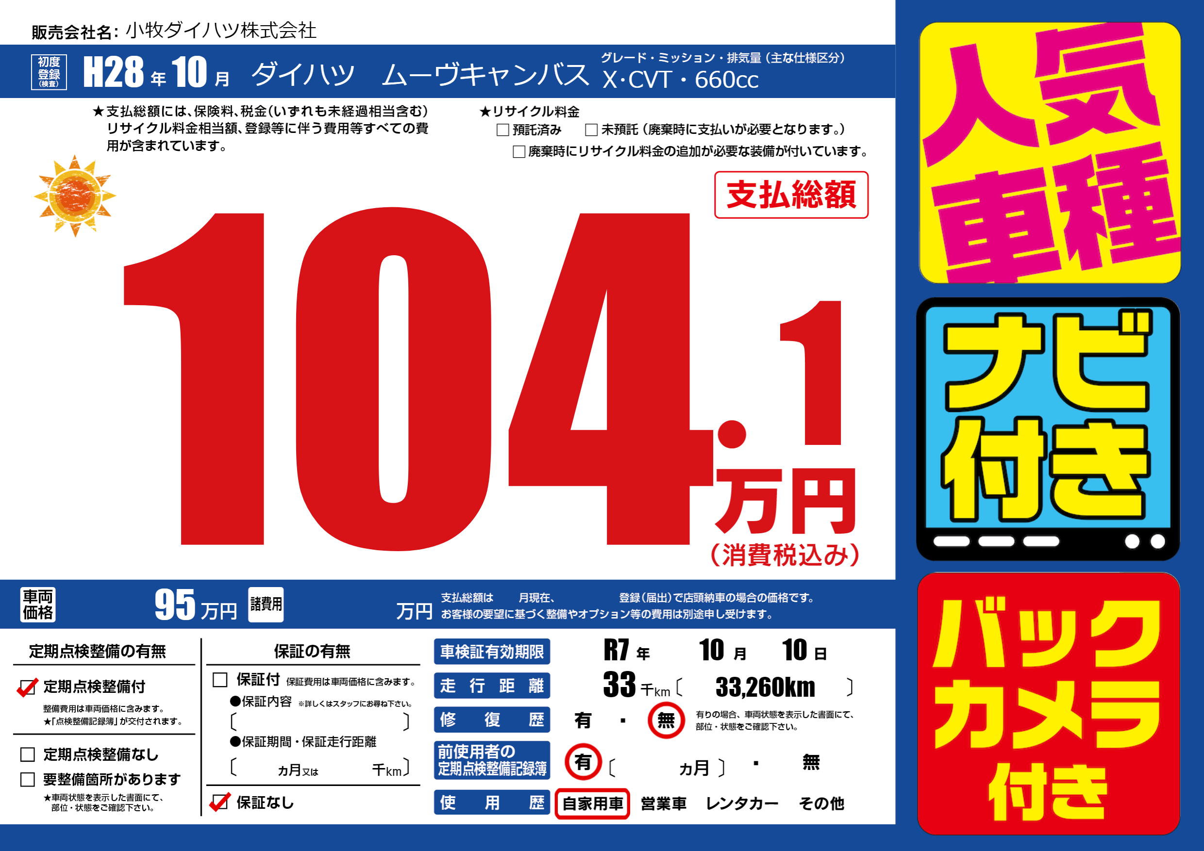 | 走行キロ | 3.3万km | 初年度登録 | H28年10月 |
