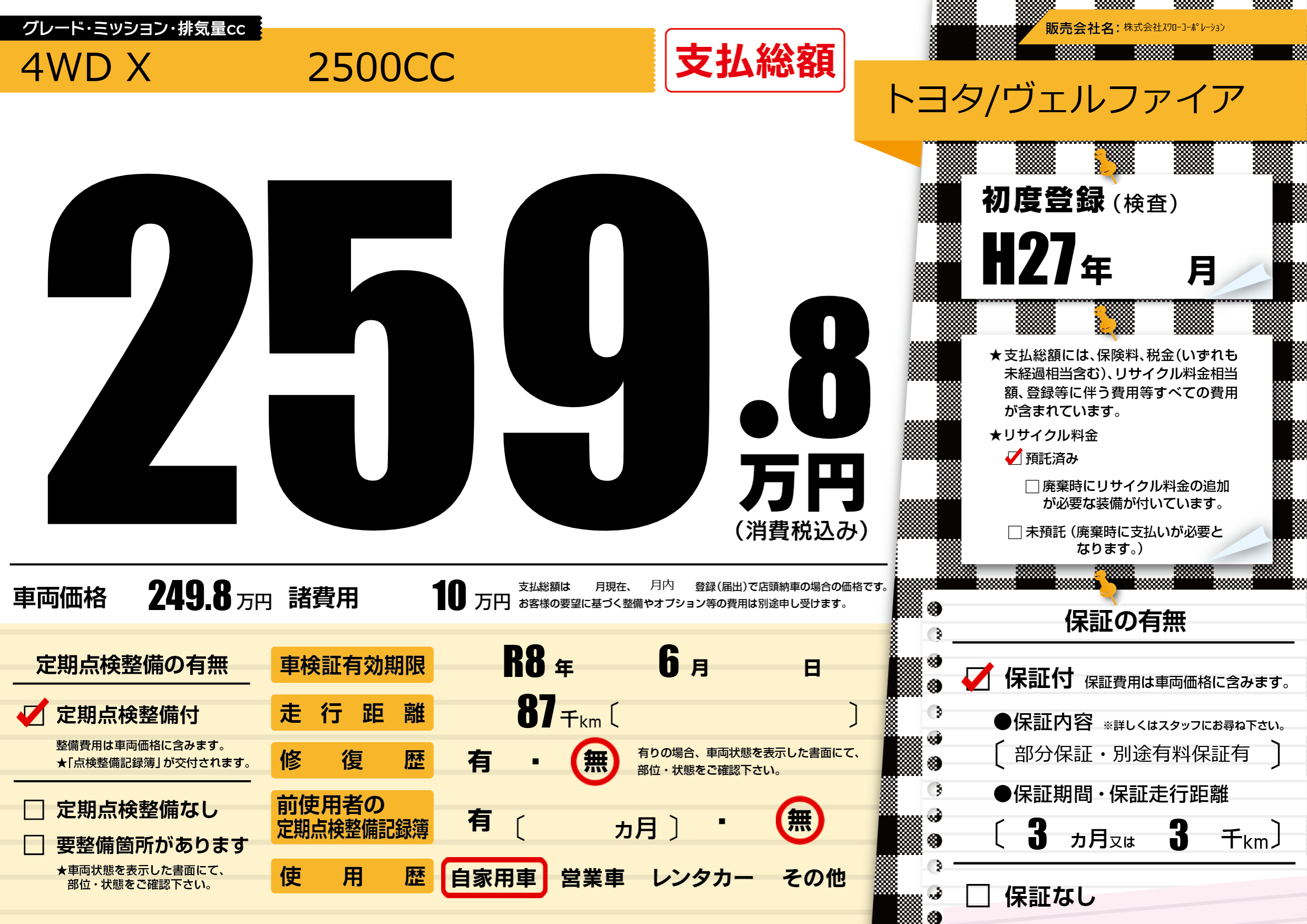 | 車名 | トヨタ/ヴェルファイア | グレード ミッション 排気量 |