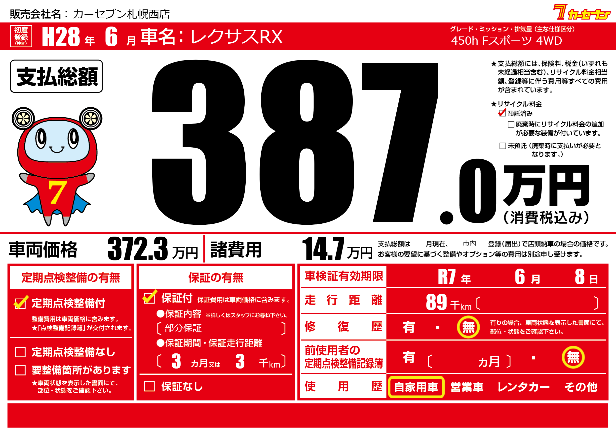 | 車名 | レクサスRX | グレード ミッション 排気量 |