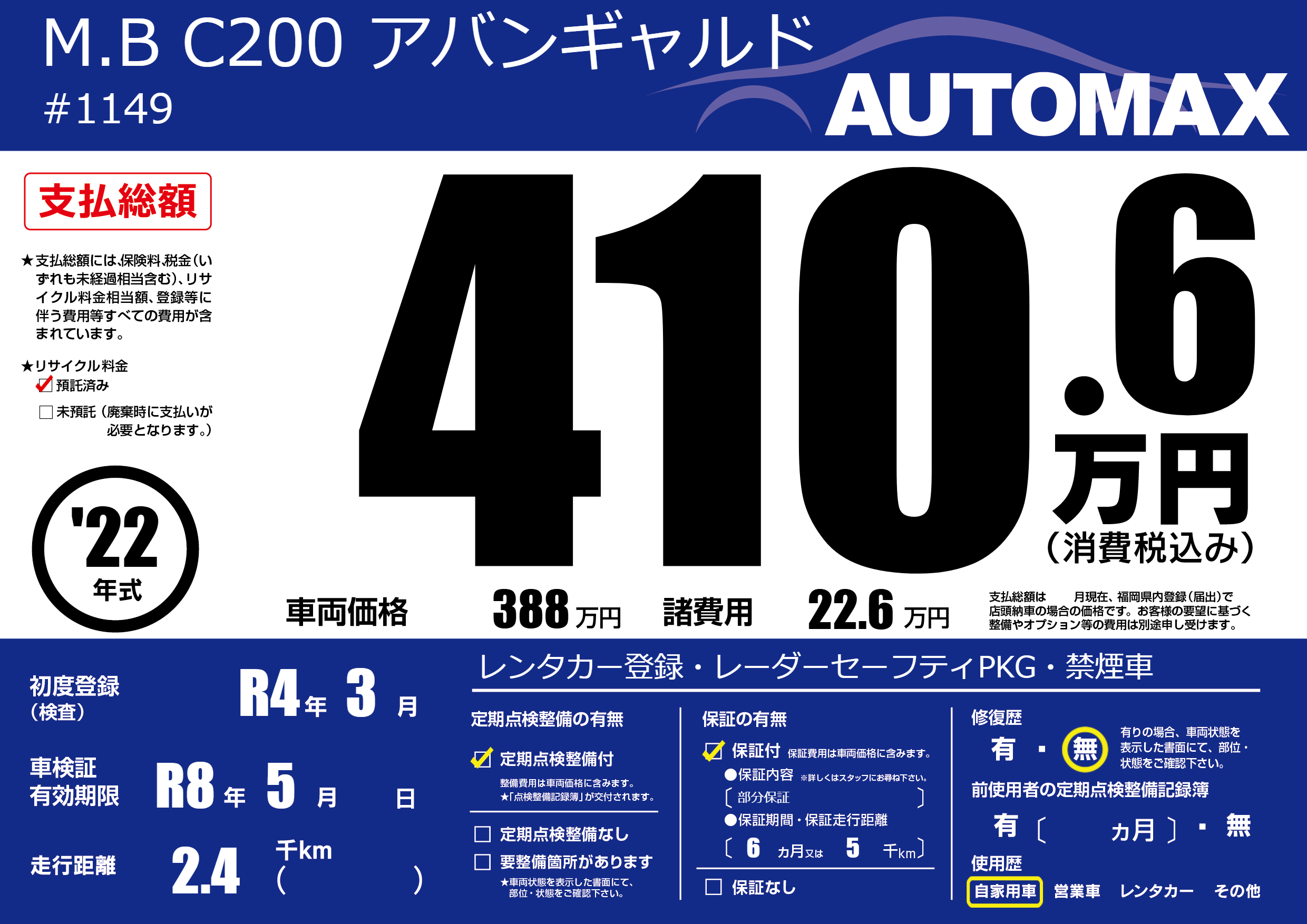 | 車名 | M.B C200 アバンギャルド | グレード ミッション 排気量 |