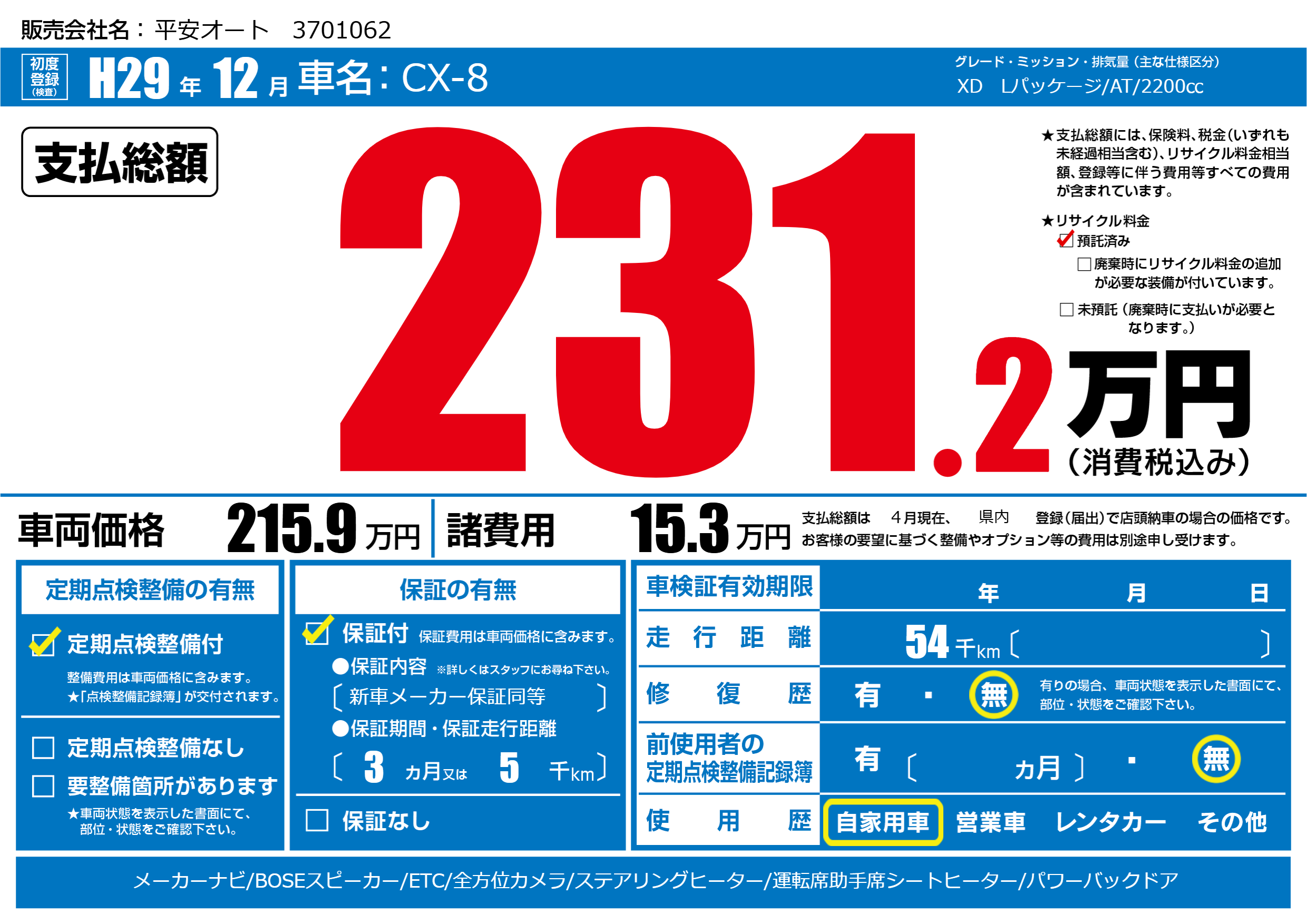 | 車名 | CX-8 | グレード ミッション 排気量 |