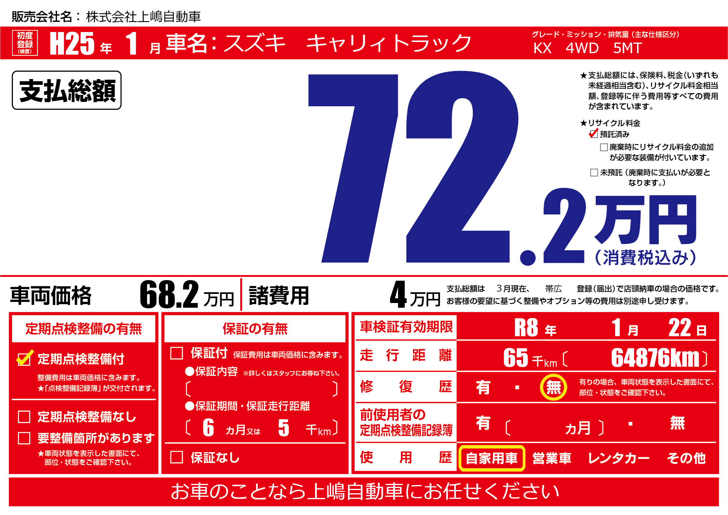 | 車名 | スズキ キャリィトラック | グレード ミッション 排気量 |
