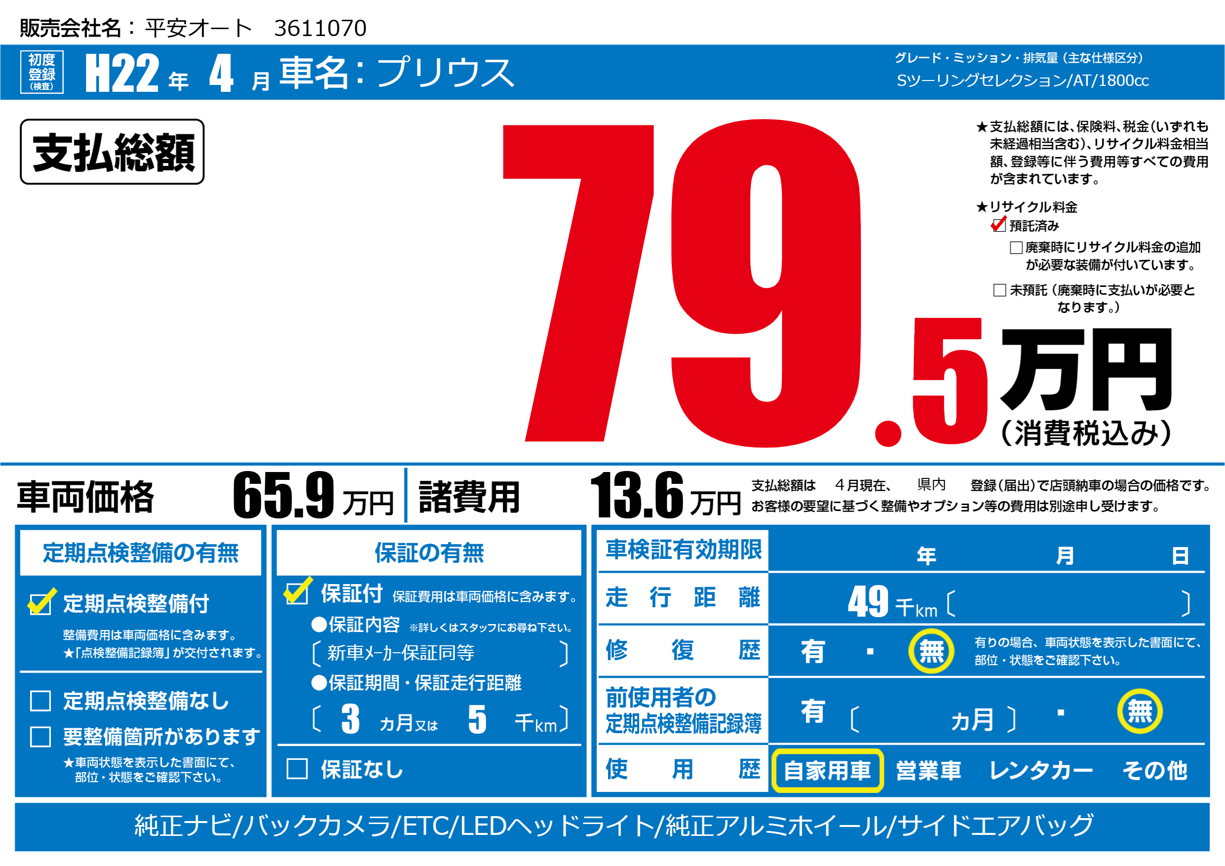 | 走行キロ | 4.9万km | 初年度登録 | H22年4月 |