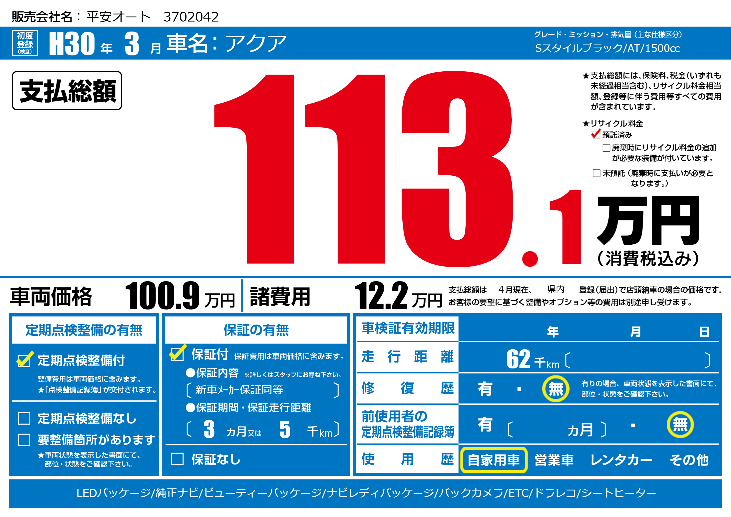 保証付き 保証内容(新車メーカー保証同等) 3ヶ月または(5)千kmまで |