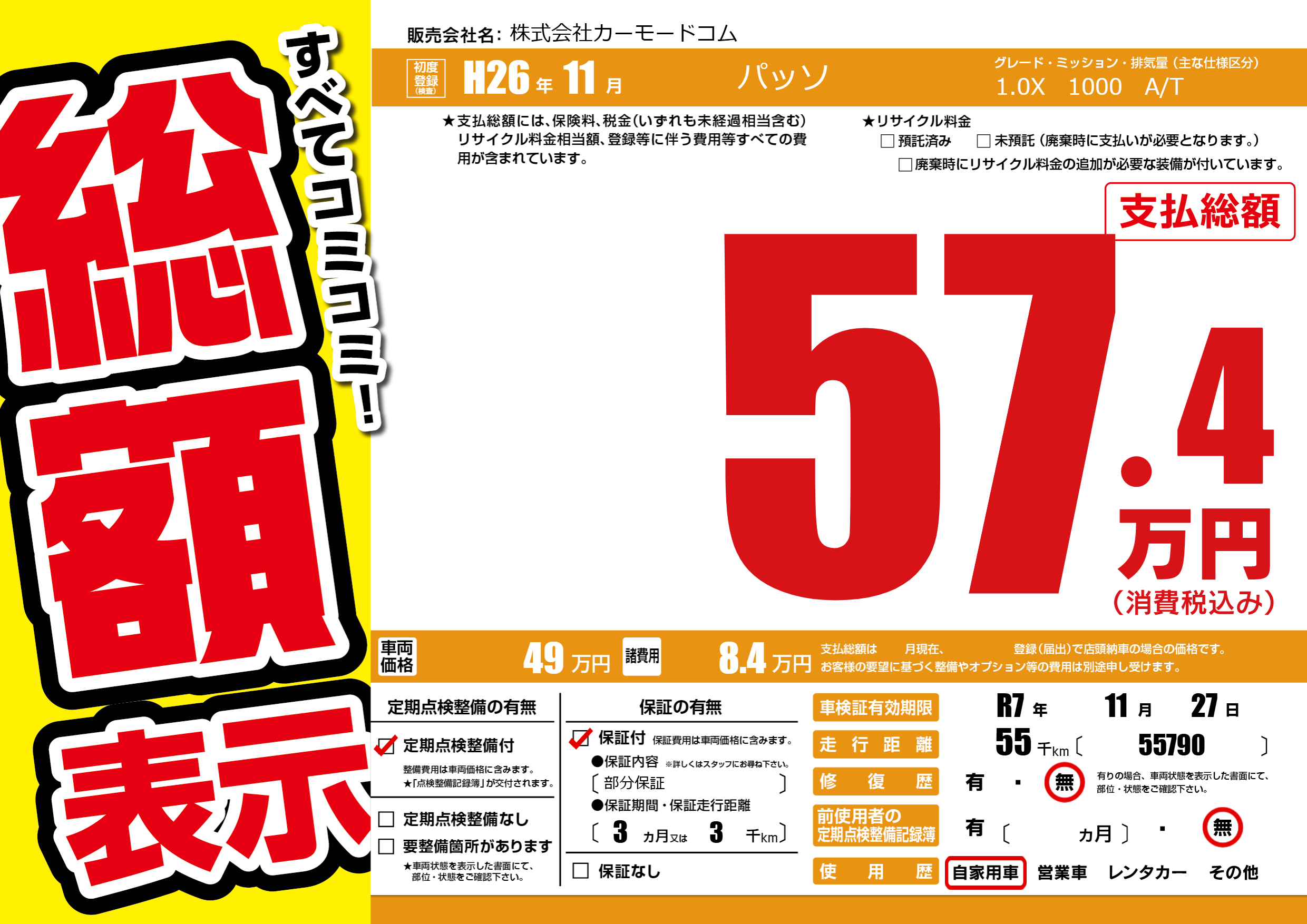 | 車名 | パッソ | グレード ミッション 排気量 |