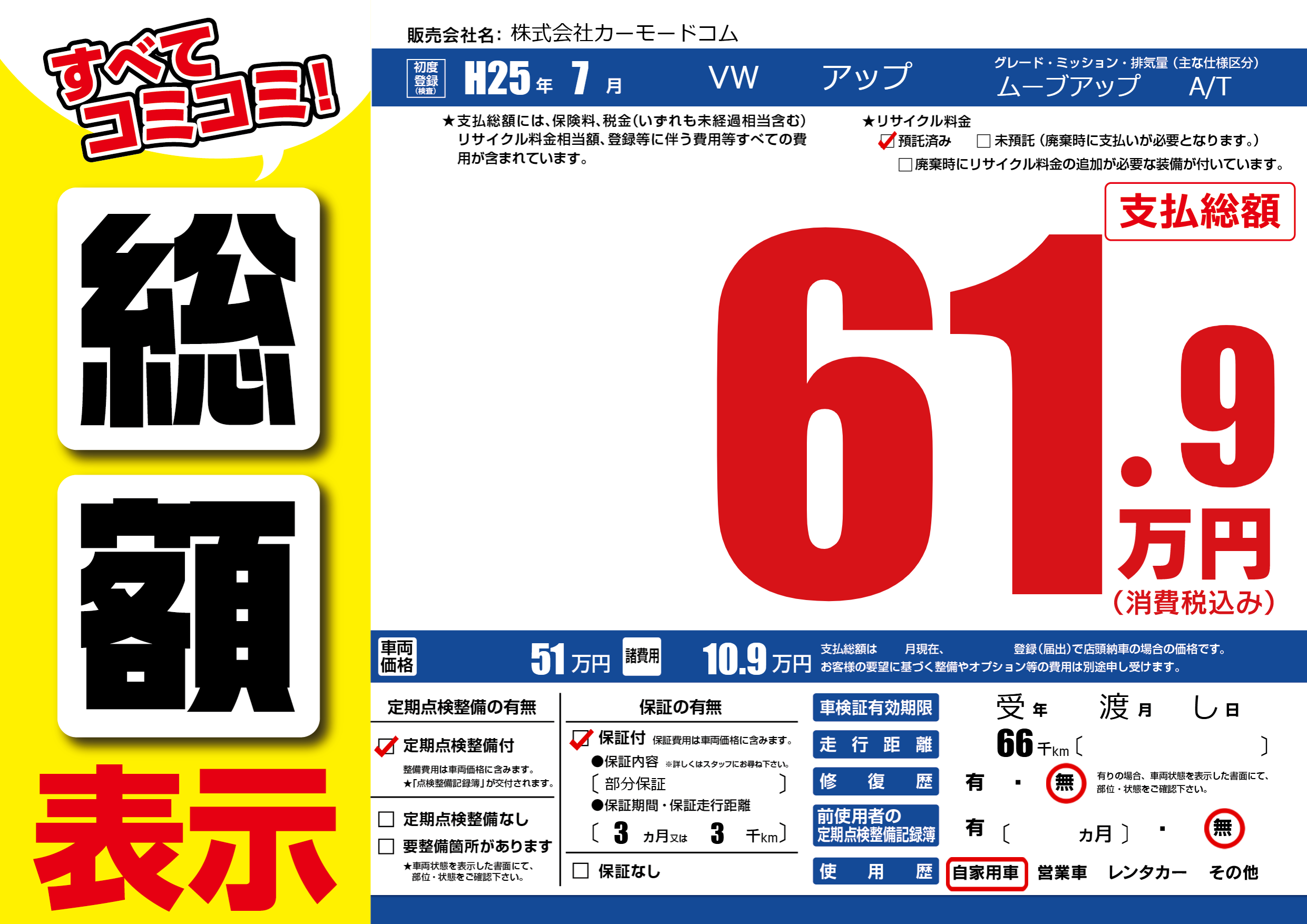| 車名 | VW アップ | グレード ミッション 排気量 |
