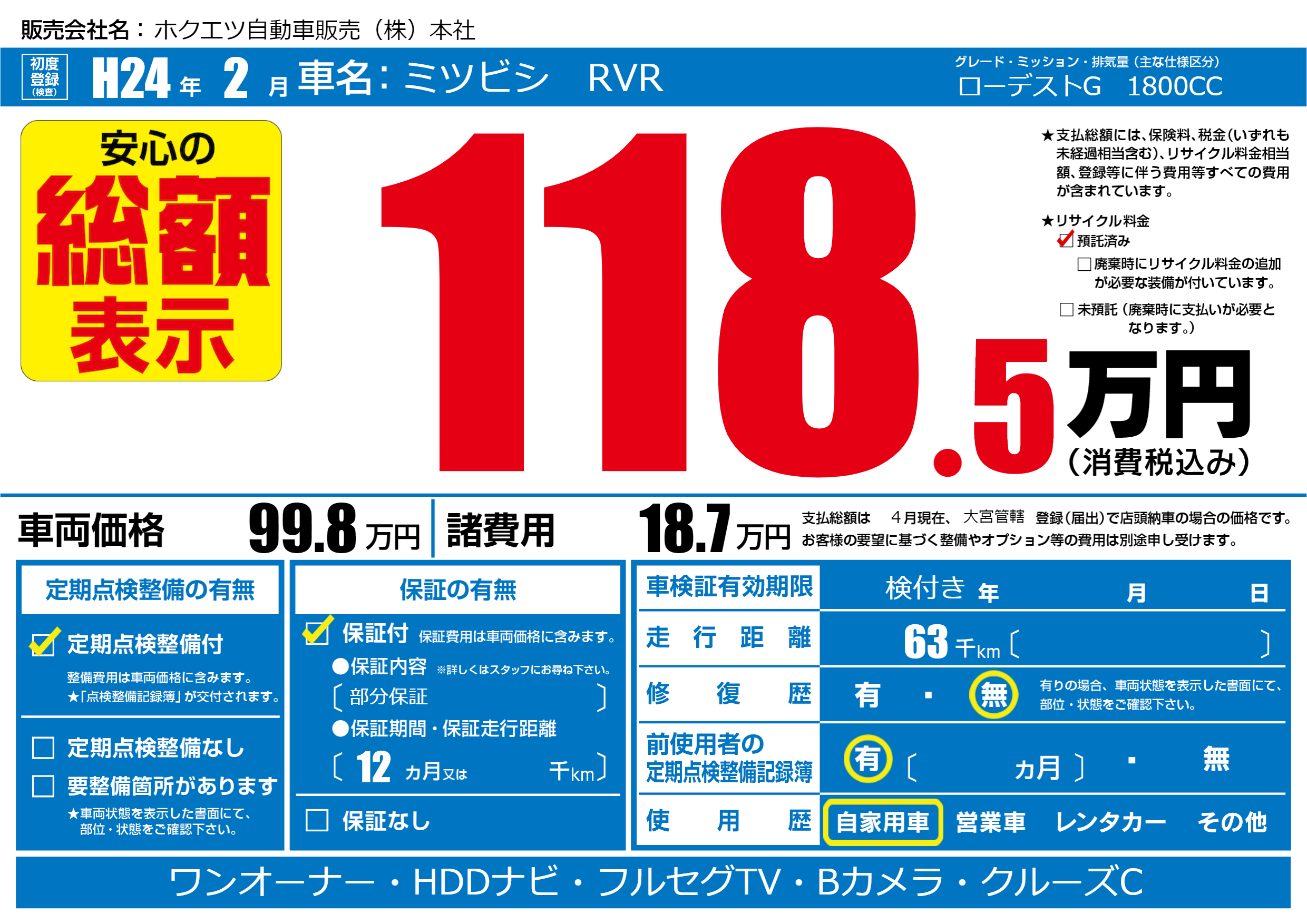 | 車名 | ミツビシ RVR | グレード ミッション 排気量 |