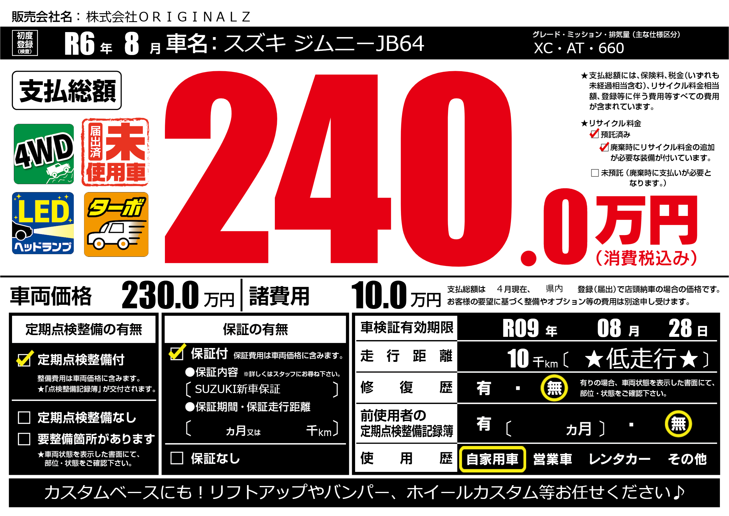 | 走行キロ | 1万km | 初年度登録 | R6年8月 |