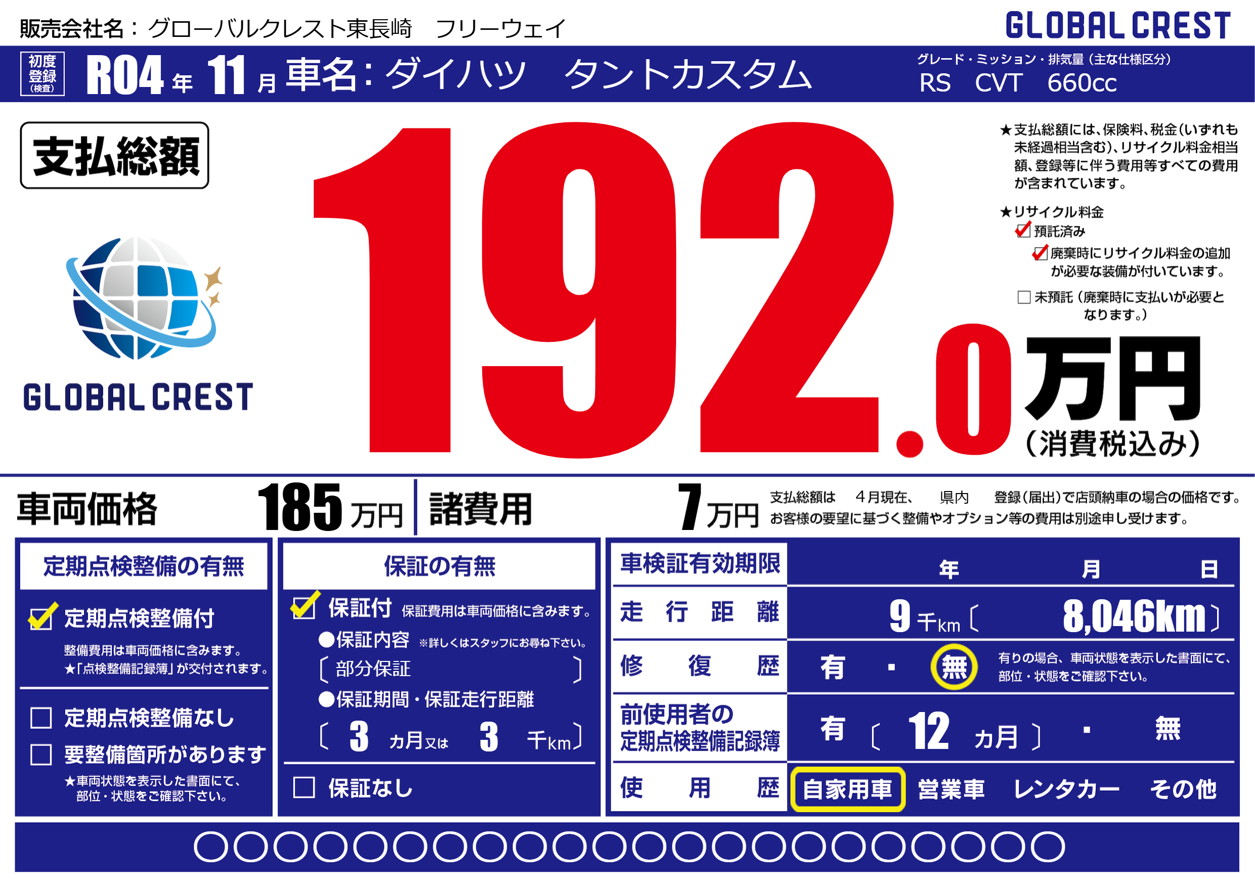 | 車名 | ダイハツ タントカスタム | グレード ミッション 排気量 |