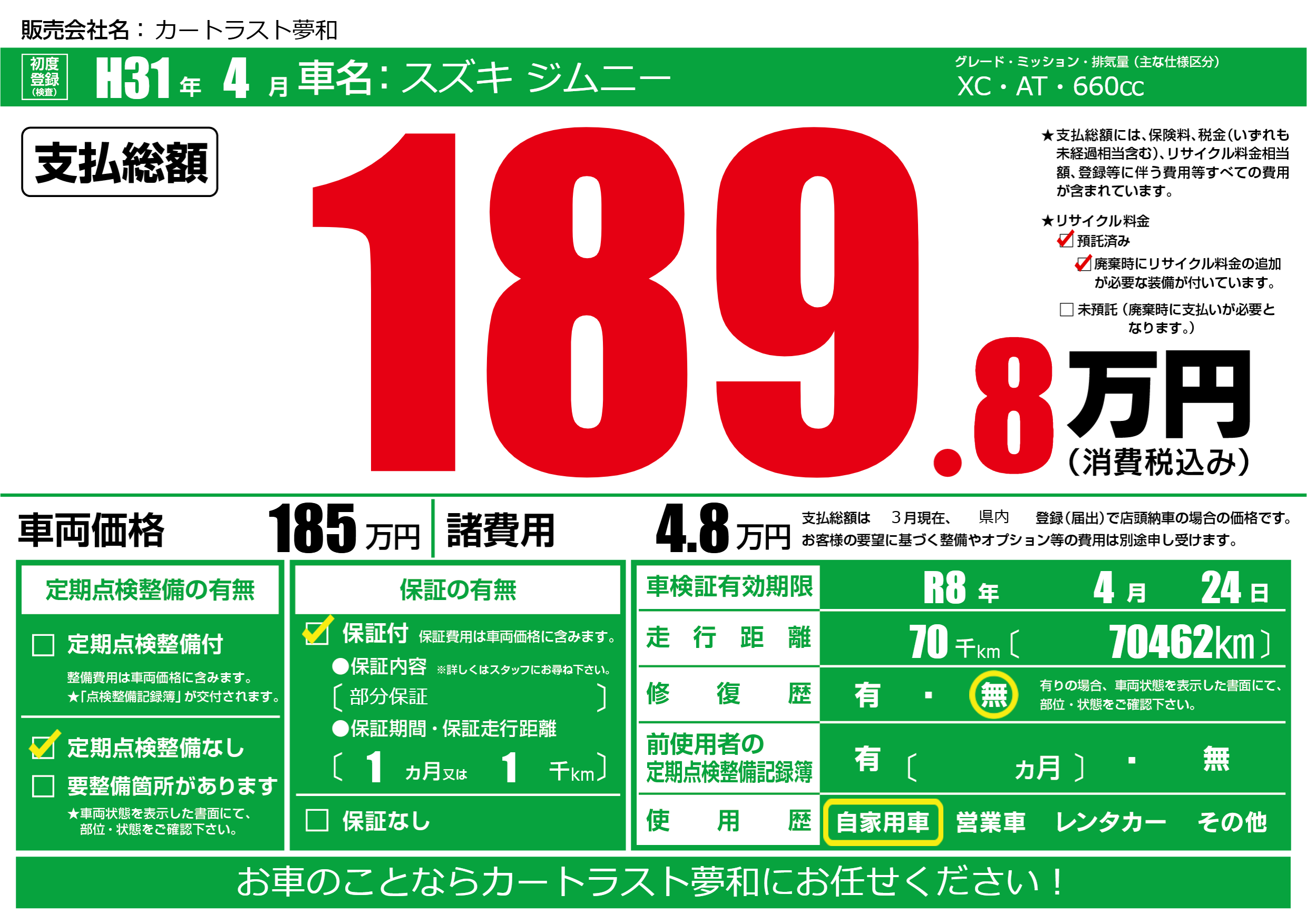 | 車名 | スズキ ジムニー | グレード ミッション 排気量 |