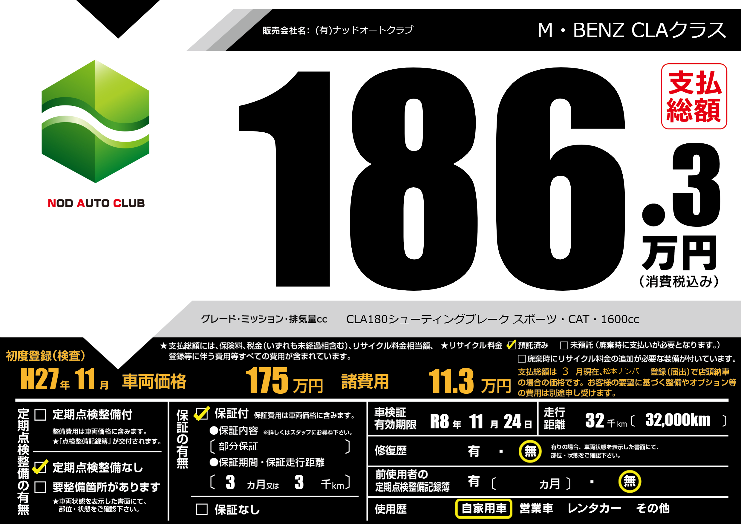 | 車名 | M・BENZ CLAクラス | グレード ミッション 排気量 |