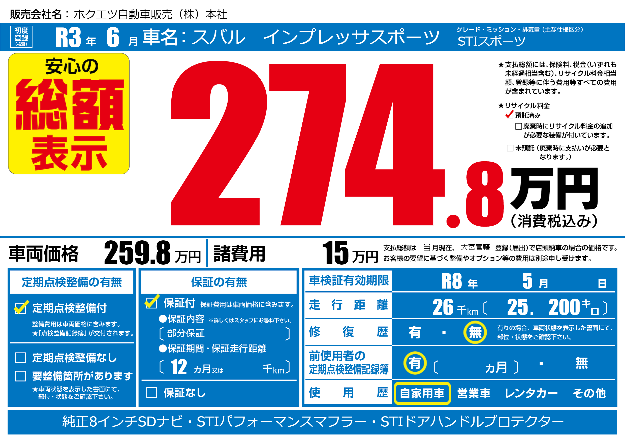 | 車名 | スバル インプレッサスポーツ | グレード ミッション 排気量 |
