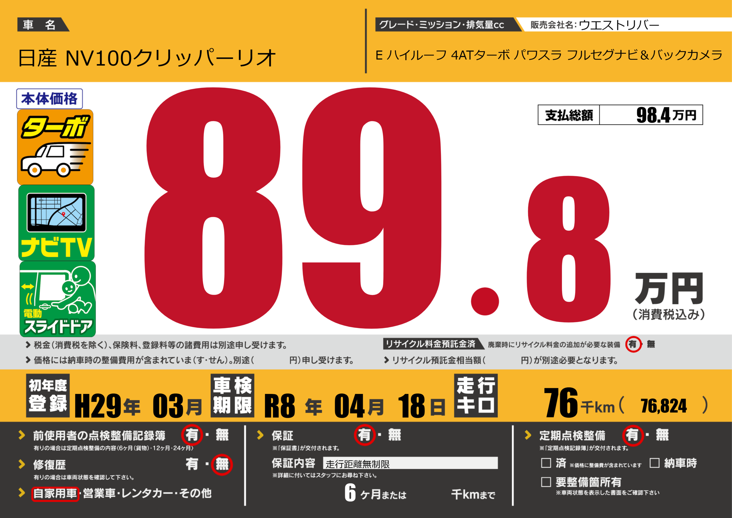 | 車名 | 日産 NV100クリッパーリオ | グレード ミッション 排気量 |