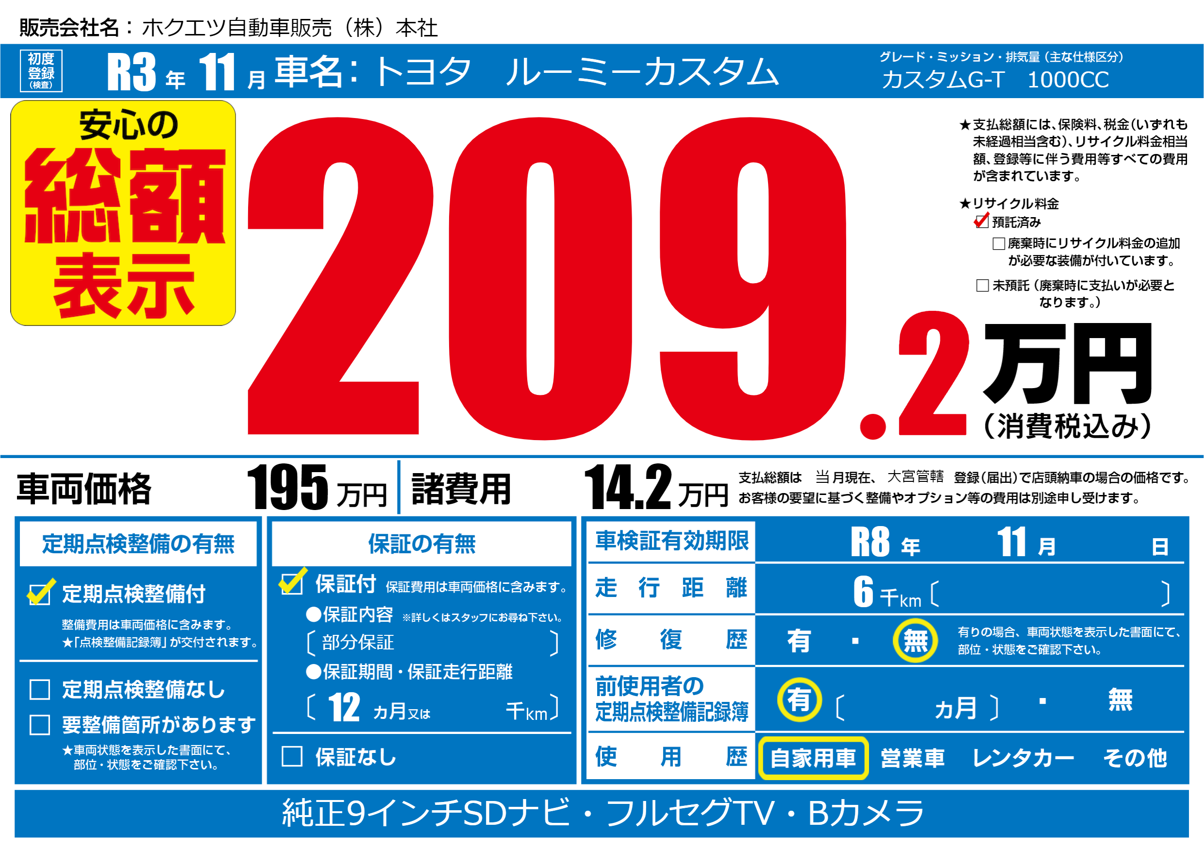 | 車名 | トヨタ ルーミーカスタム | グレード ミッション 排気量 |