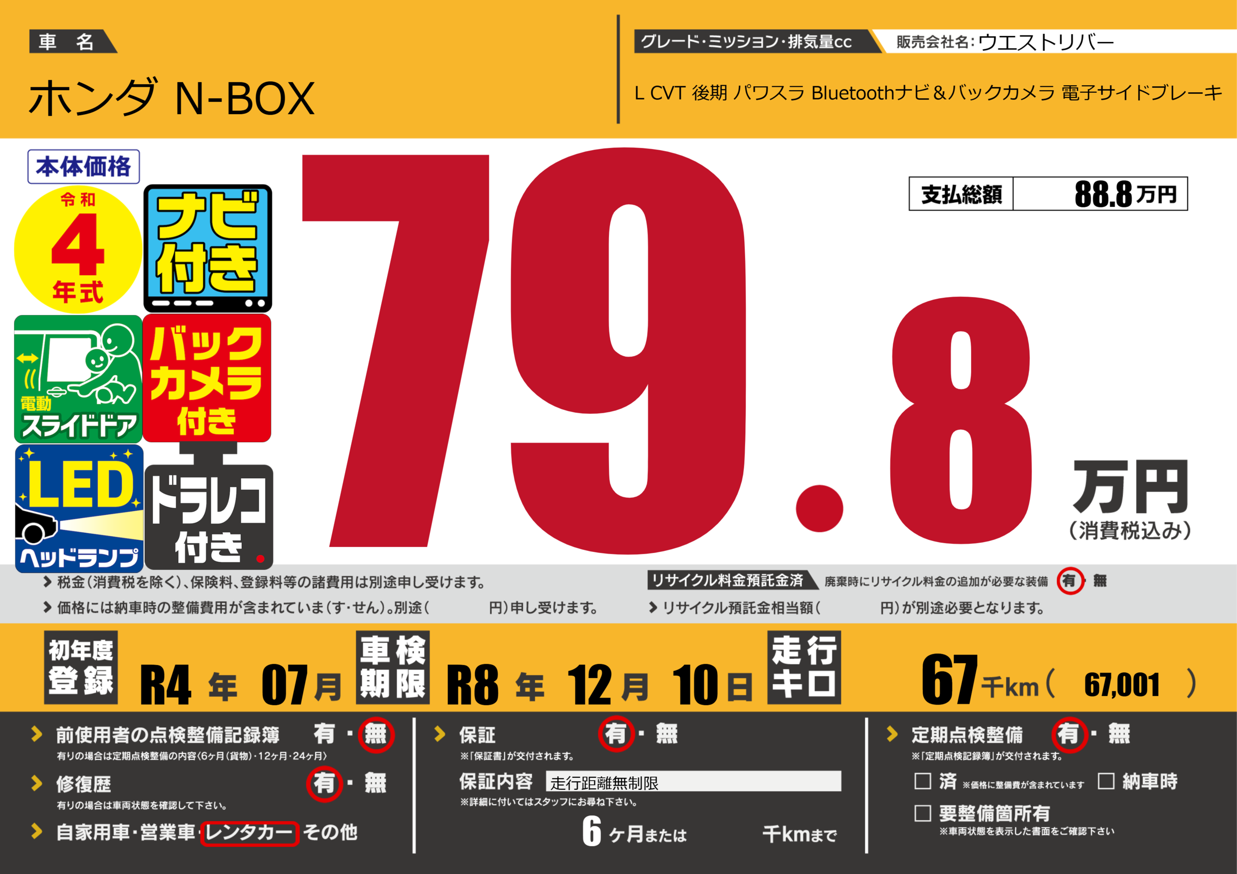 | 走行キロ | 6.7万km | 初年度登録 | R4年07月 |