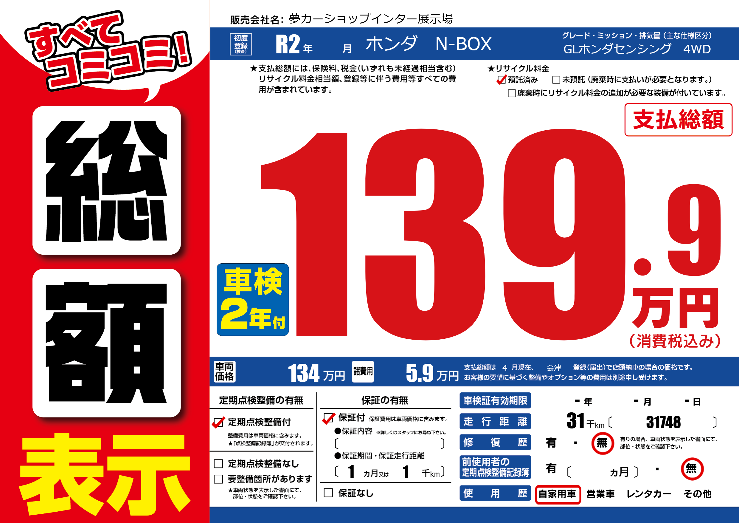 | 車名 | ホンダ N-BOX | グレード ミッション 排気量 |