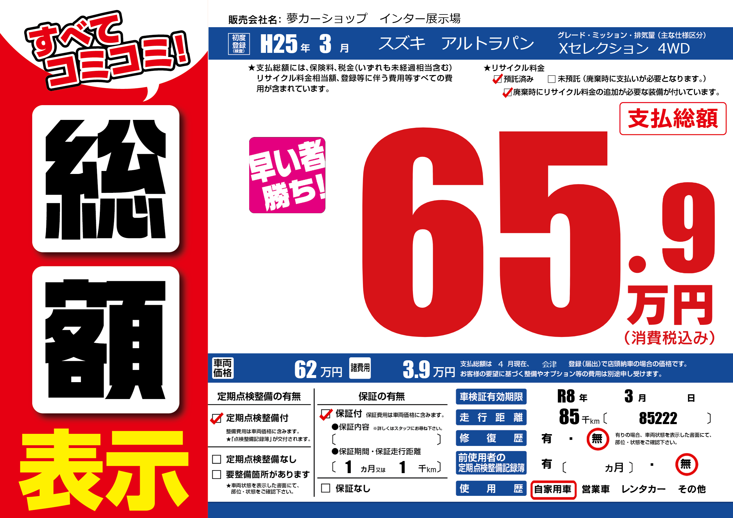 | 走行キロ | 8.5万km | 初年度登録 | H25年3月 |
