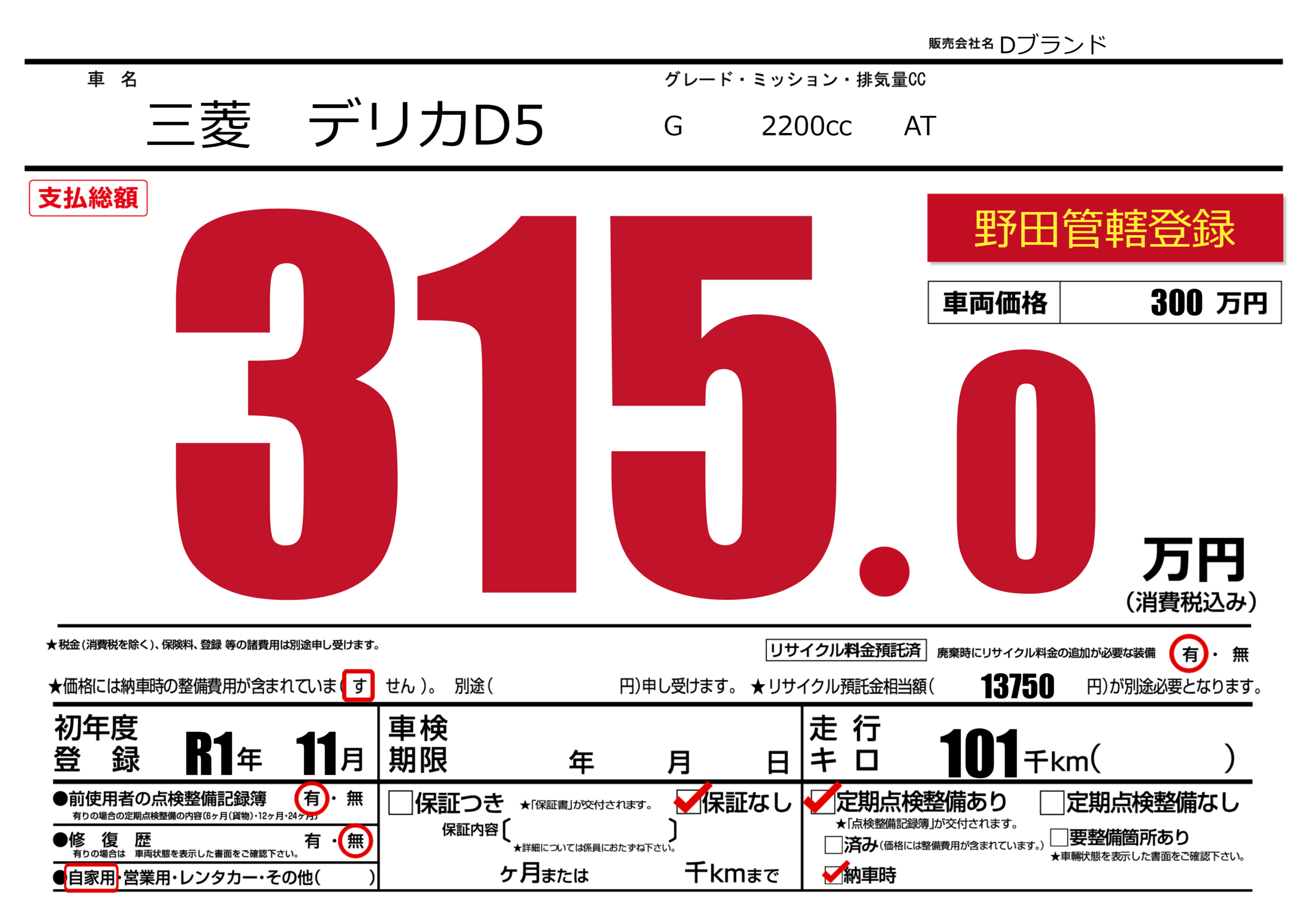 | 車名 | 三菱 デリカD5 | グレード ミッション 排気量 |