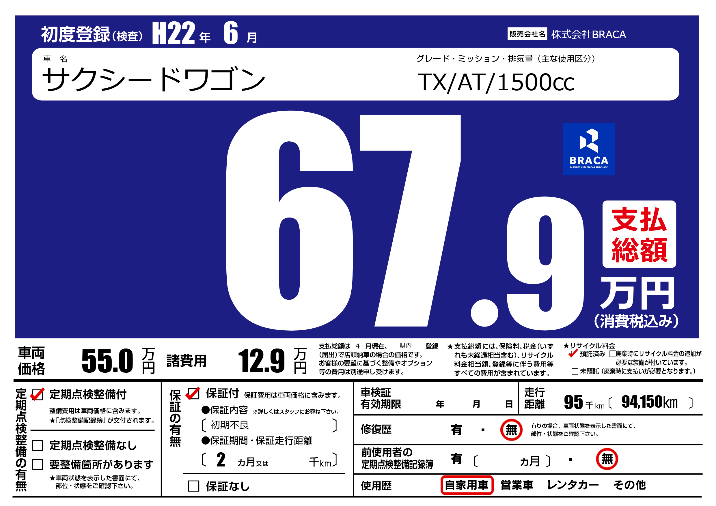 | 車名 | サクシードワゴン | グレード ミッション 排気量 |