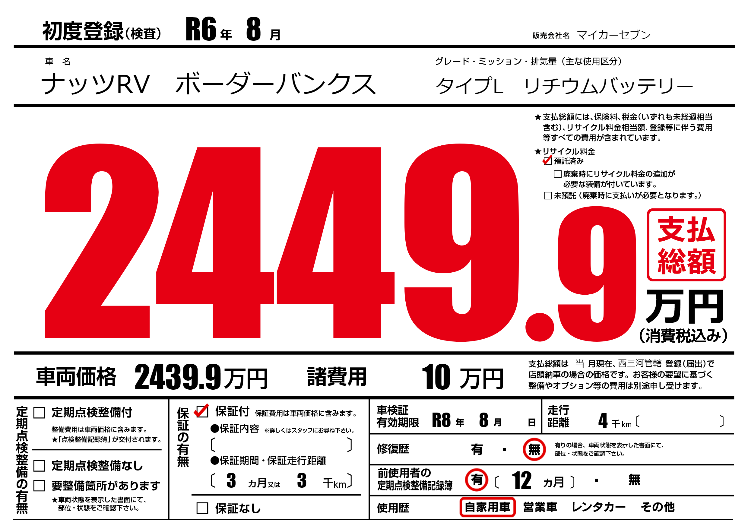 なし | 車検制限 | R8年8月---月 |