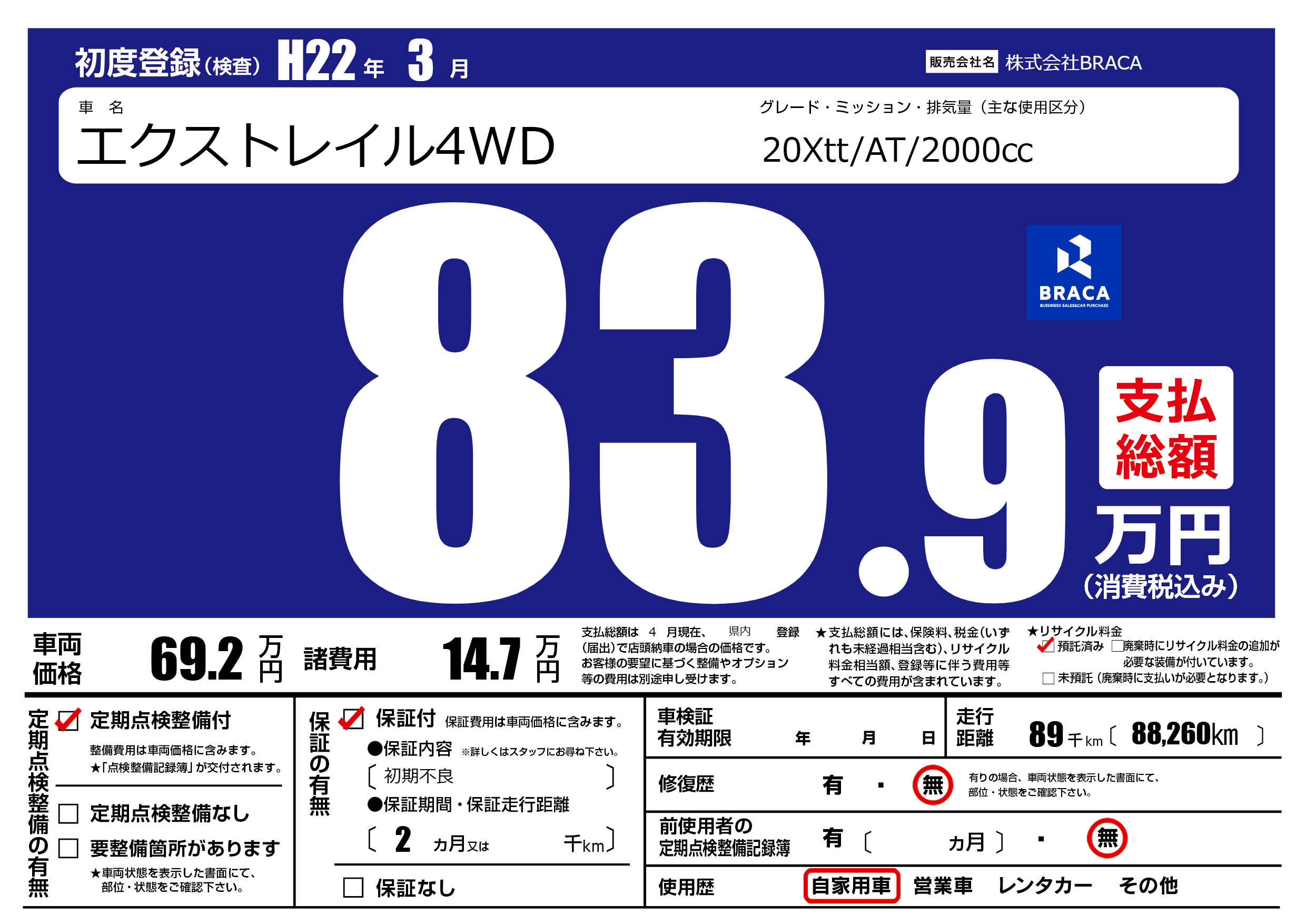 | 車名 | エクストレイル4WD | グレード ミッション 排気量 |