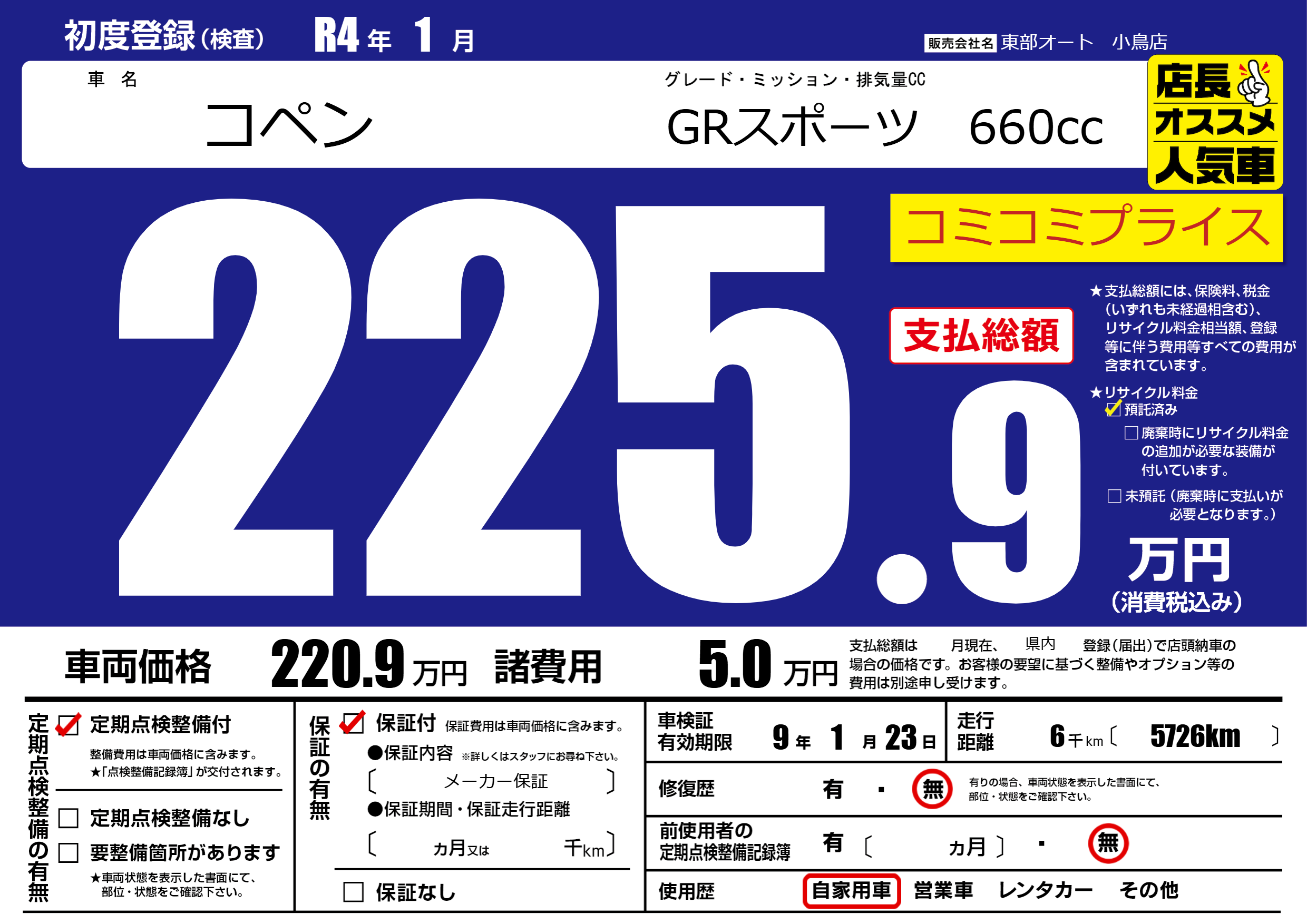 | 走行キロ | 0.6万km | 初年度登録 | R4年1月 |
