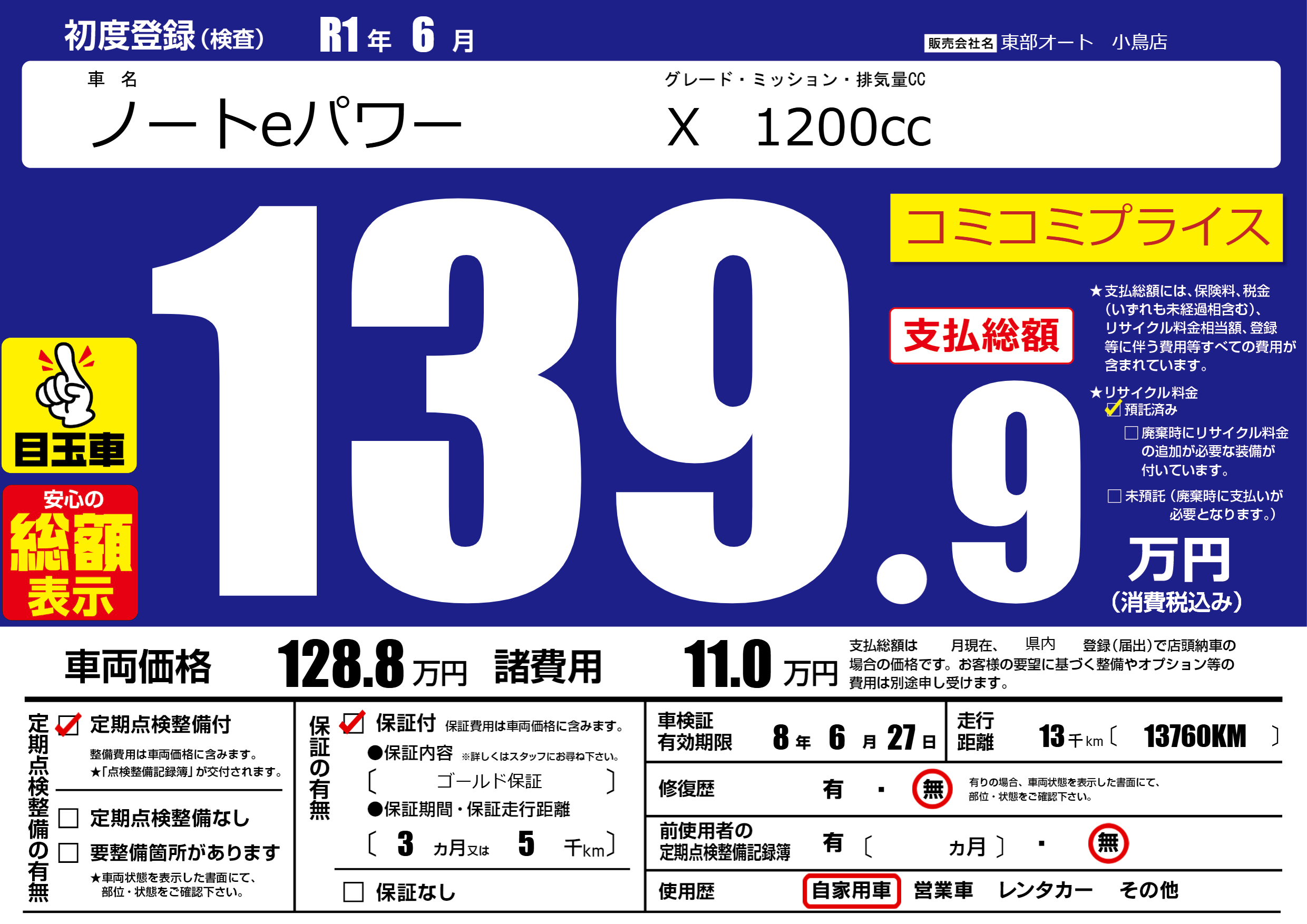 | 車名 | ノートeパワー | グレード ミッション 排気量 |