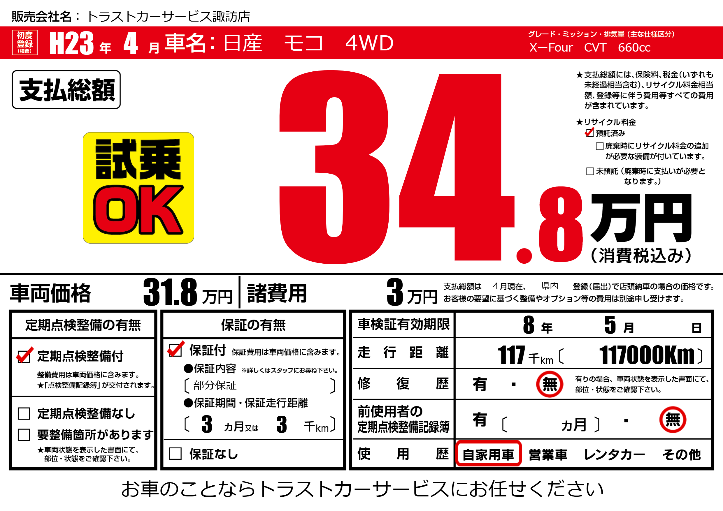| 車名 | 日産 モコ 4WD | グレード ミッション 排気量 |