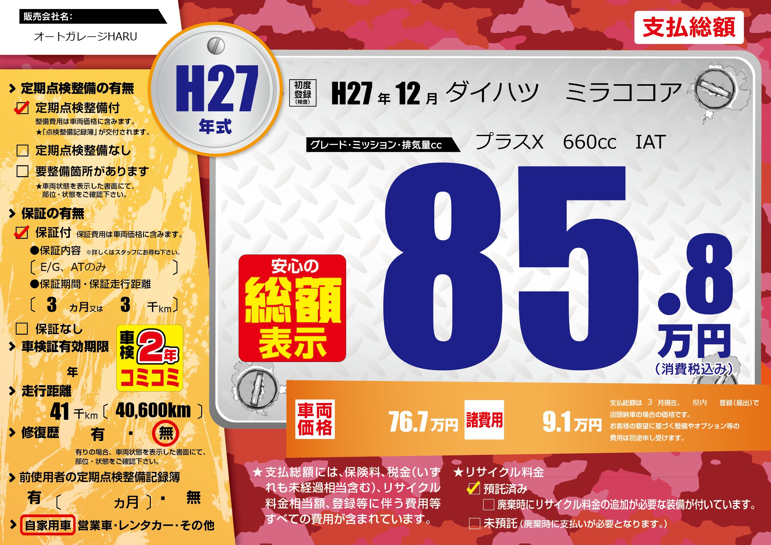 | 車名 | ダイハツ ミラココア | グレード ミッション 排気量 |