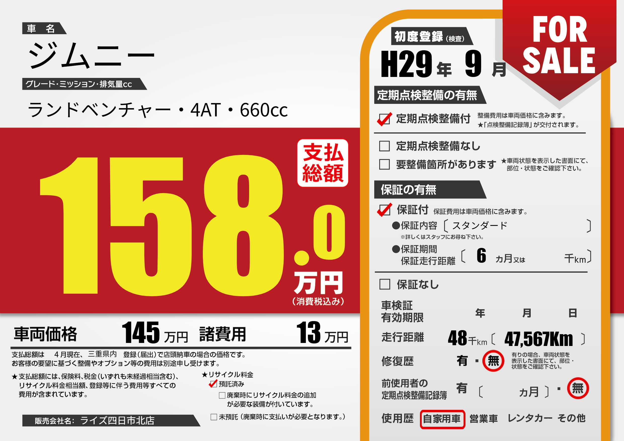 | 車名 | ジムニー | グレード ミッション 排気量 |