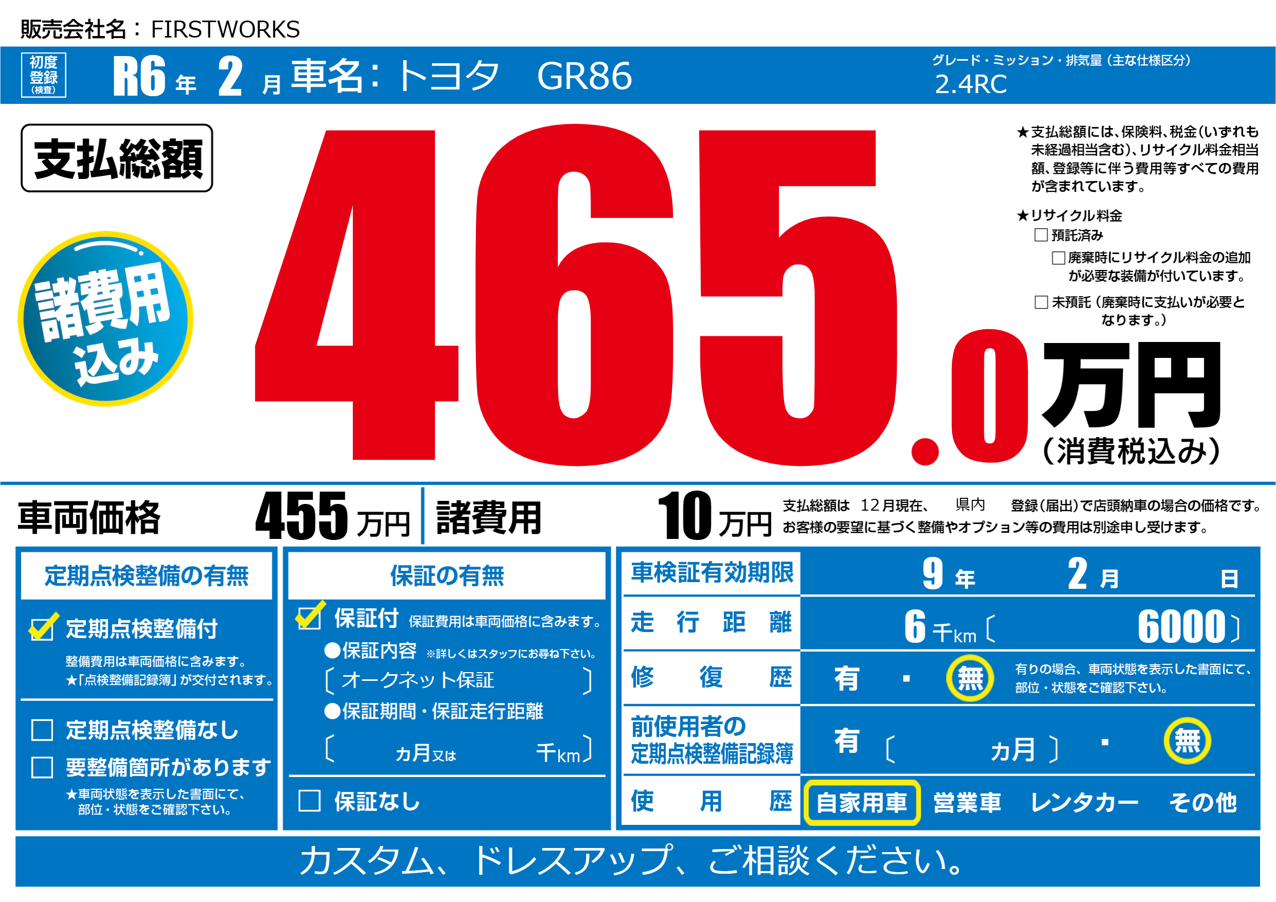 | 車名 | トヨタ GR86 | グレード ミッション 排気量 |
