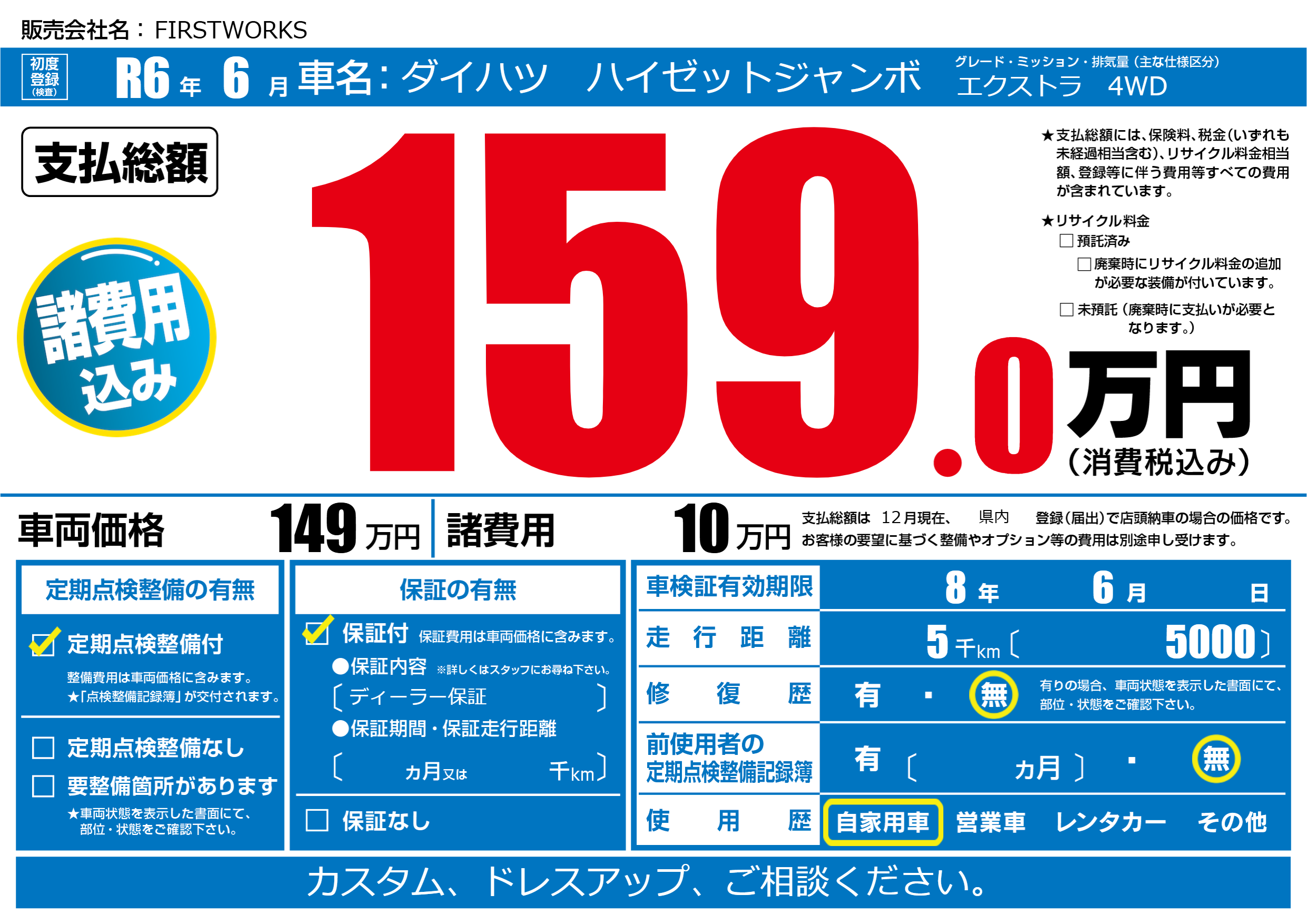 | 走行キロ | 0.5万km | 初年度登録 | R6年6月 |