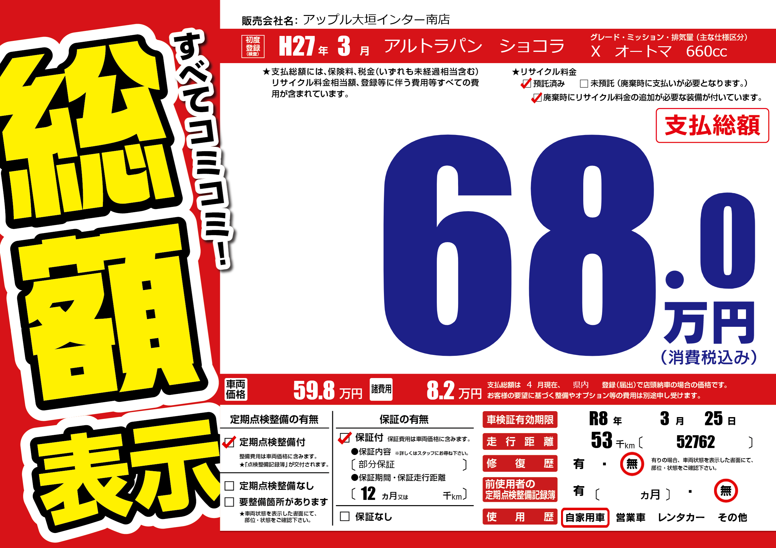 | 走行キロ | 5.3万km | 初年度登録 | H27年3月 |