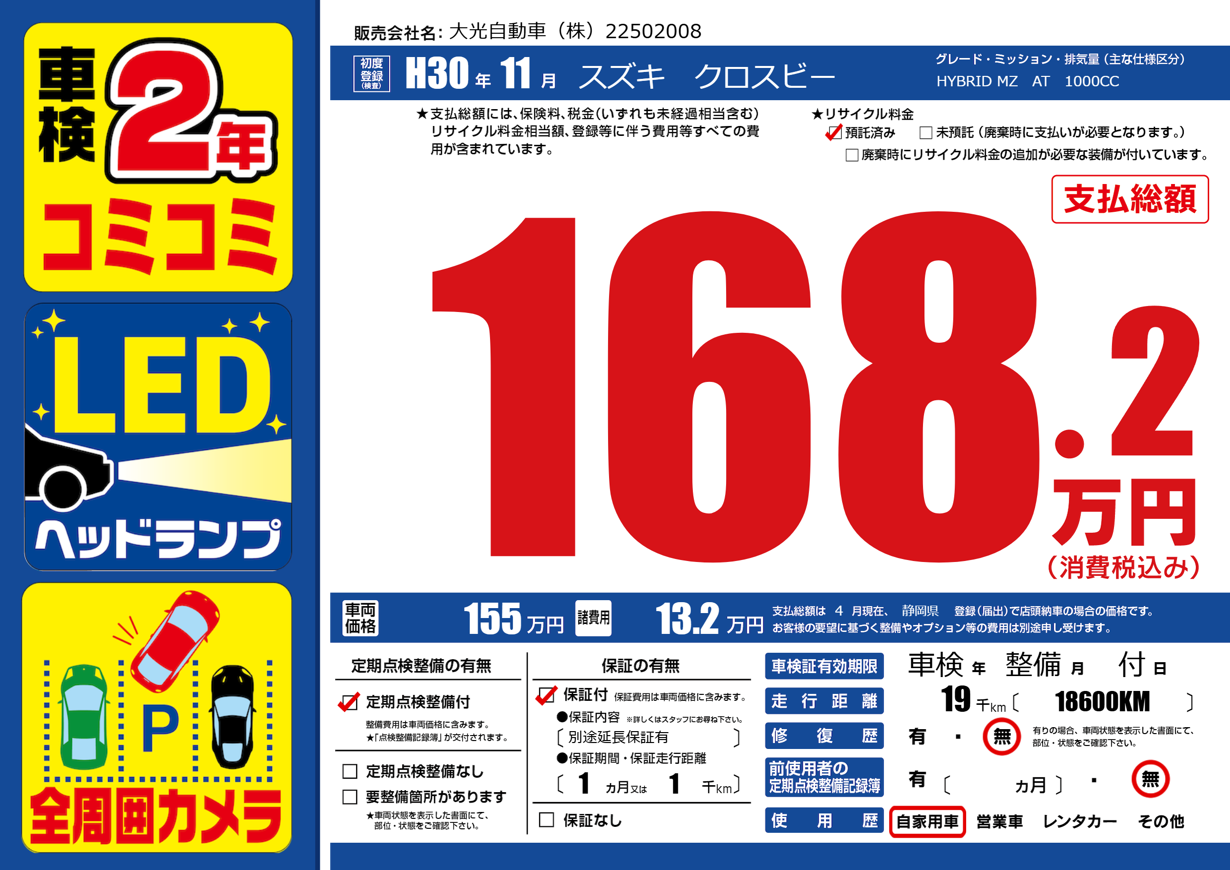 | 走行キロ | 1.9万km | 初年度登録 | H30年11月 |